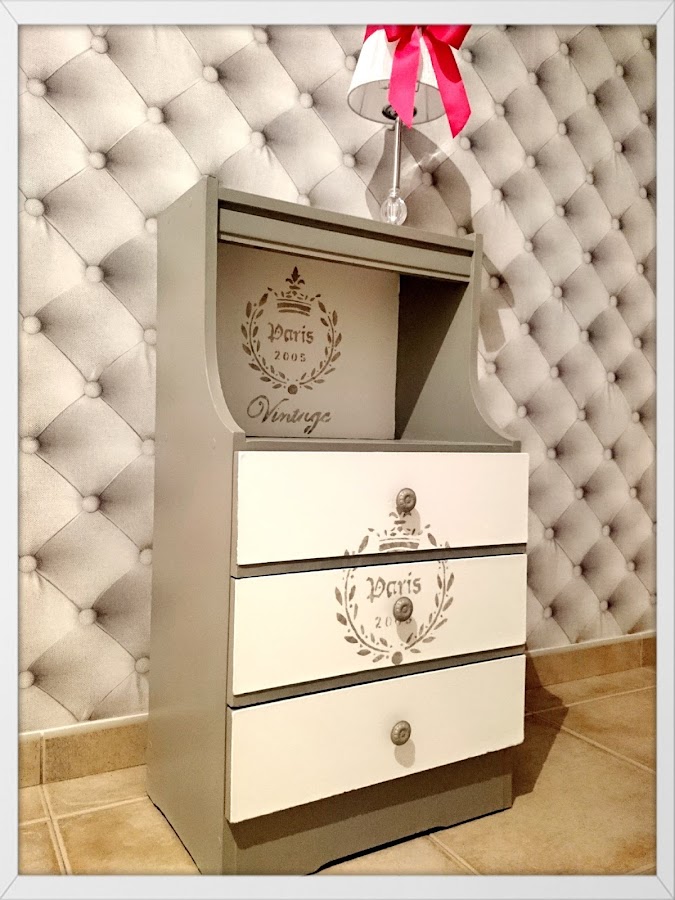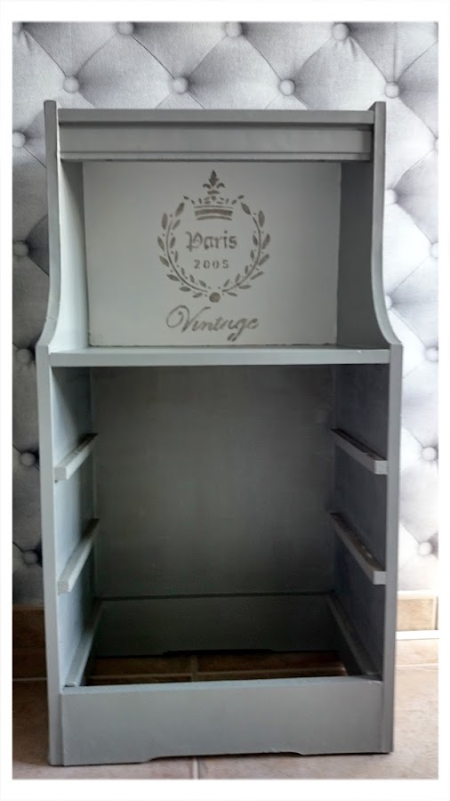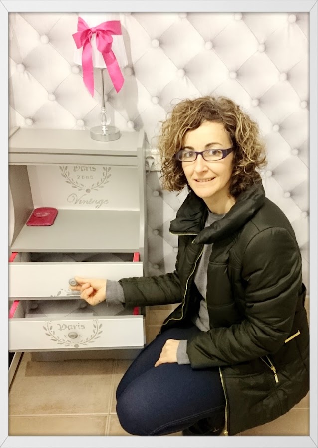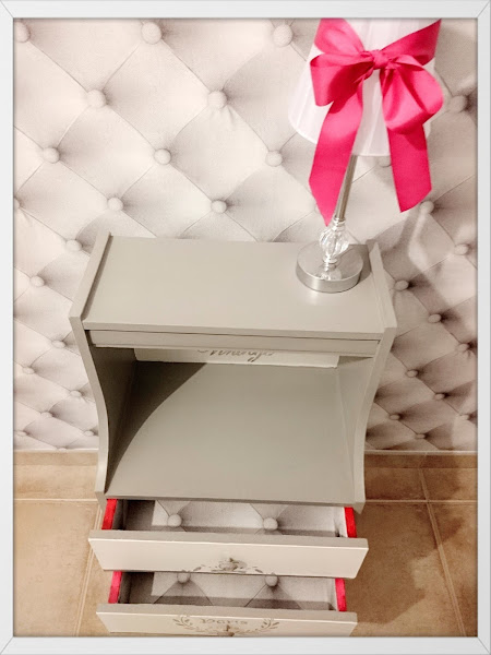 La historia de esta mesita de los años 50, comienza como la típica de muchos muebles..... reforma de una vivienda...muebles nuevos ¿como no? ......¡muebles viejos al contenedor de obra!, es un pena pero realmente es así, con la de posibilidades que tienen pero en fin.... así es la vida. Donde unos ven trastos otros vemos posibilidades.....¿o no? porque realmente fue coste cero. Aunque la primera visión, no me dijo nada...realmente es fea, ¡dije para mí!...¡esta no tiene solución!, pero al final después de las dudas decidí llevármela a ver que se me ocurría, estuve dándole vueltas y vueltas y como no lo tenía claro nada, comencé pintándola en gris, con una pintura que tenía de sobra de un trabajo anterior, aquello ya cambió totalmente, tuve una visión, de lo que quería, decidí hacer de ella la pieza mas hermosa con un estilo romántico, ya que me inspiró muchísimo un viaje a Francia que realicé y que me apasionó . Así fue como si de una historia de amor se tratase, ya que no fue un amor a primera vista, pero con el tiempo me enamoró como pasa en muchas historias ......que tienen un final feliz.
