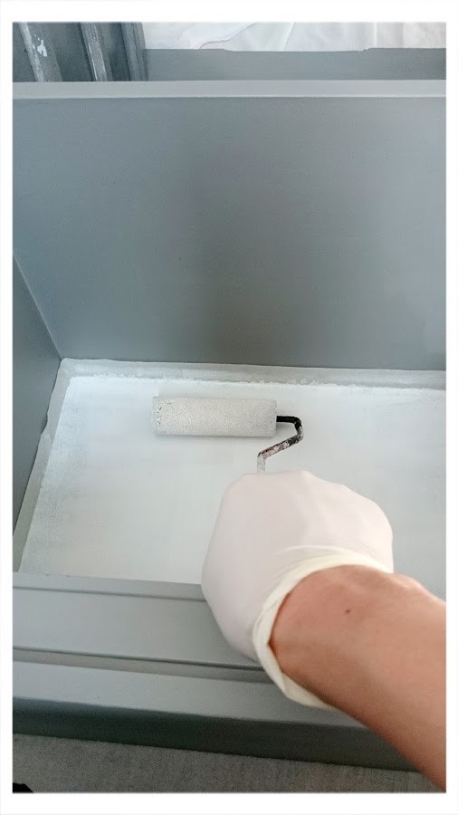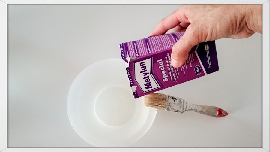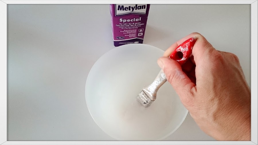 Lo siguiente fué empapelar el interior de los cajones, comencé haciendo una mezcla, de cola para papel, siguiendo las instrucciones del fabricante, lo hice en un tazón ya que usé una mínima cantidad.