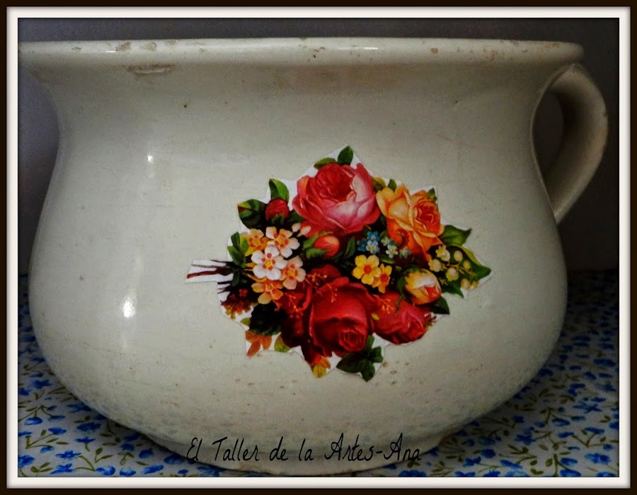 Como antiguamente estas mesitas de noche tenían estas puertas para guardar el orinal me pareció que el complemento perfecto, para las fotos, claro, era este precioso orinal que compré en el último rastro de antigüedades. Era liso y yo le he pegado estas flores de aire victoriano.