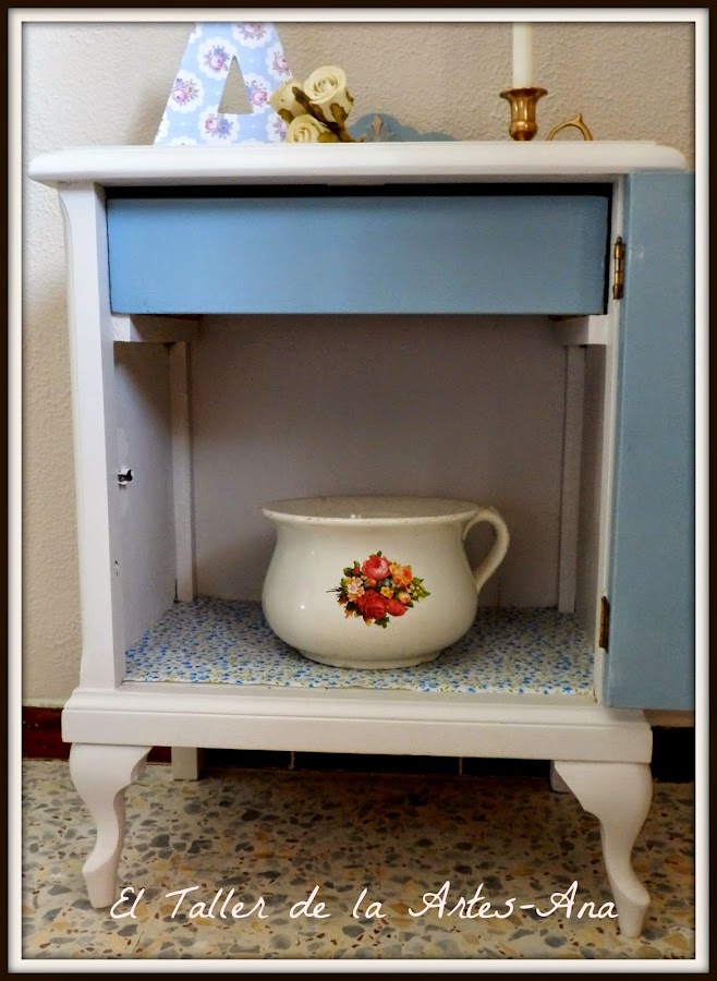 He forrado el interior con un papel adhesivo de florecitas azules tanto del cajón como de la parte inferior.