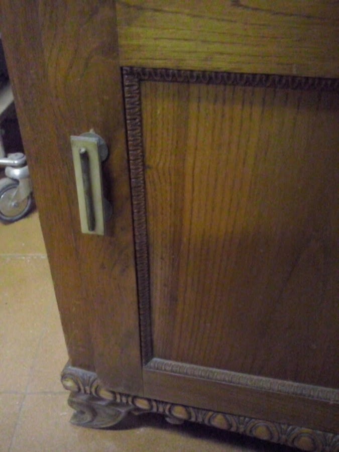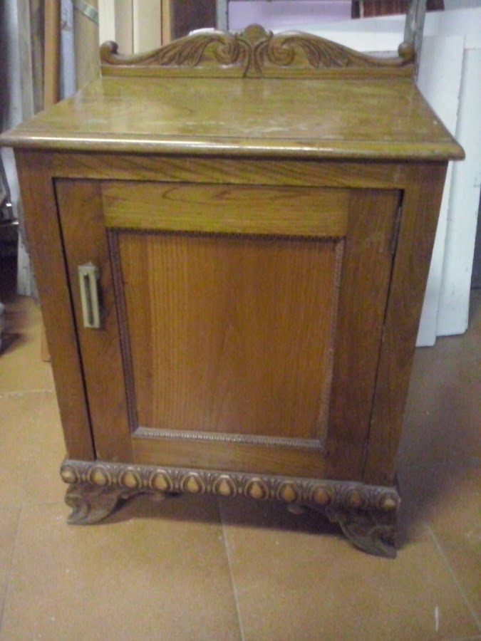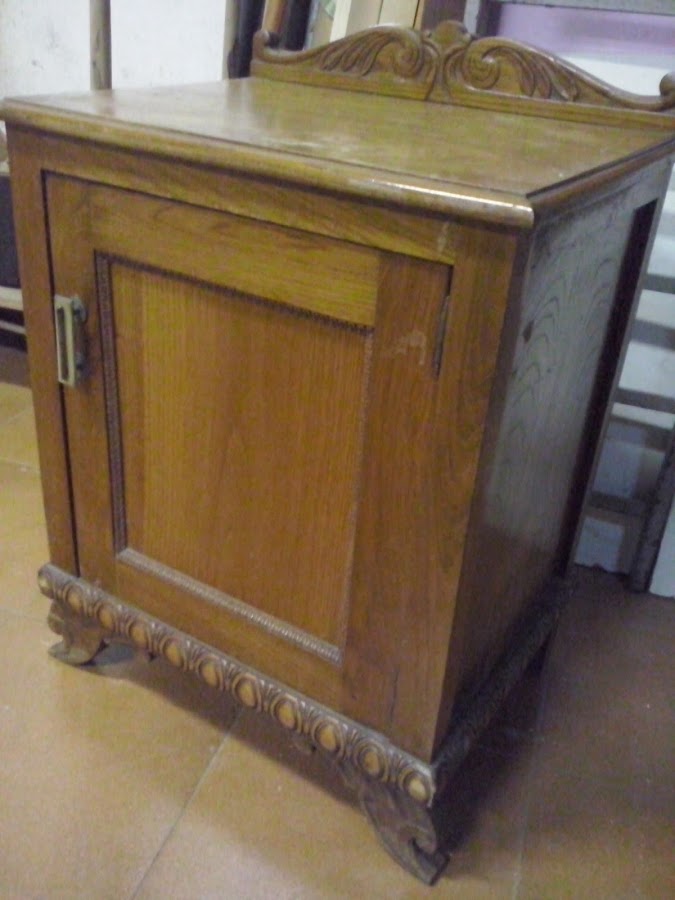 Se trata de una pieza realizada en madera de castaño con cajón interior también todo en madera, y con su copete clásico, auque algo diferente a los consabidos que siempre me encuentro y que tanto abundaban. En la parte inferior lleva una moldurita de las que tanto me gustan por lo que embellecen la pieza y el juego que nos puede dar.