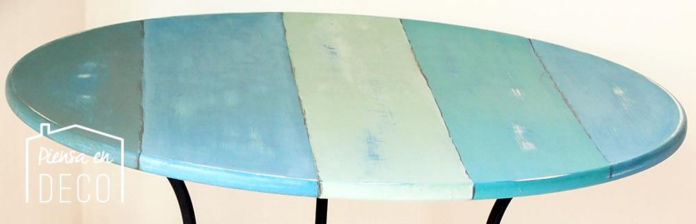 En algunos puntos lijaremos hasta ver el color original de la mesa y en otros sólo hasta mostrar el azul de base. Recordad que este acabado no es más que una sugerencia, la intención de este post es demostrar que la chalk paint y la técnica del decapado pueden usarse en cualquier superficie, ya lo hemos usado sobre madera y ahora sobre metal. Por ultimo, con ayuda de un pincel fino y a mano alzada, trazaremos unas líneas discontinuas y poco definidas para crear el efecto sombreado de separación entre viejos listones de madera.