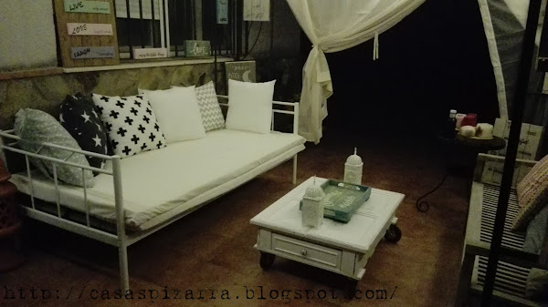 Antes de despedirme decir que teníamos guardada una cama metálica, era la que nuestra hija pequeña tenía en su habitación, y nos vino estupendamente para montarnos un chill-out en el porche, mi mujer compró un par de colchonetas de espuma, forró unos cojines y todo quedó bajo un velador al que le colocamos unas tiras de luces y adornamos un poco con algunas de las tablillas que en otras entradas os he enseñado. Y así quedó todo: