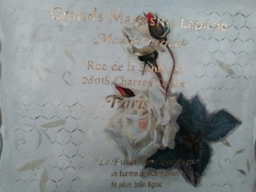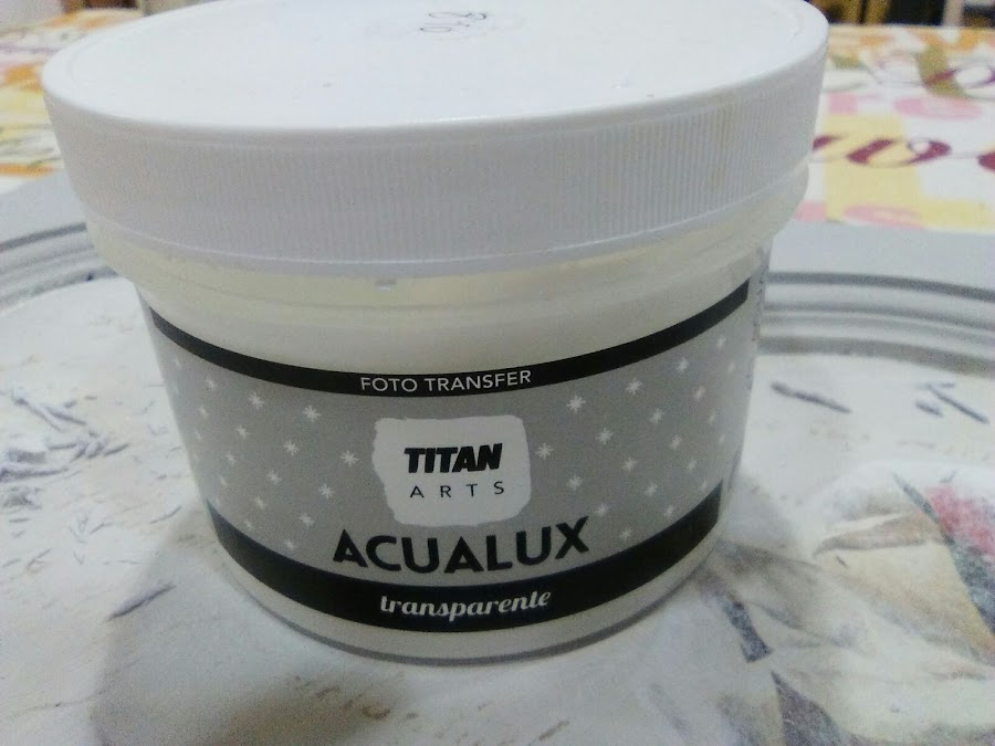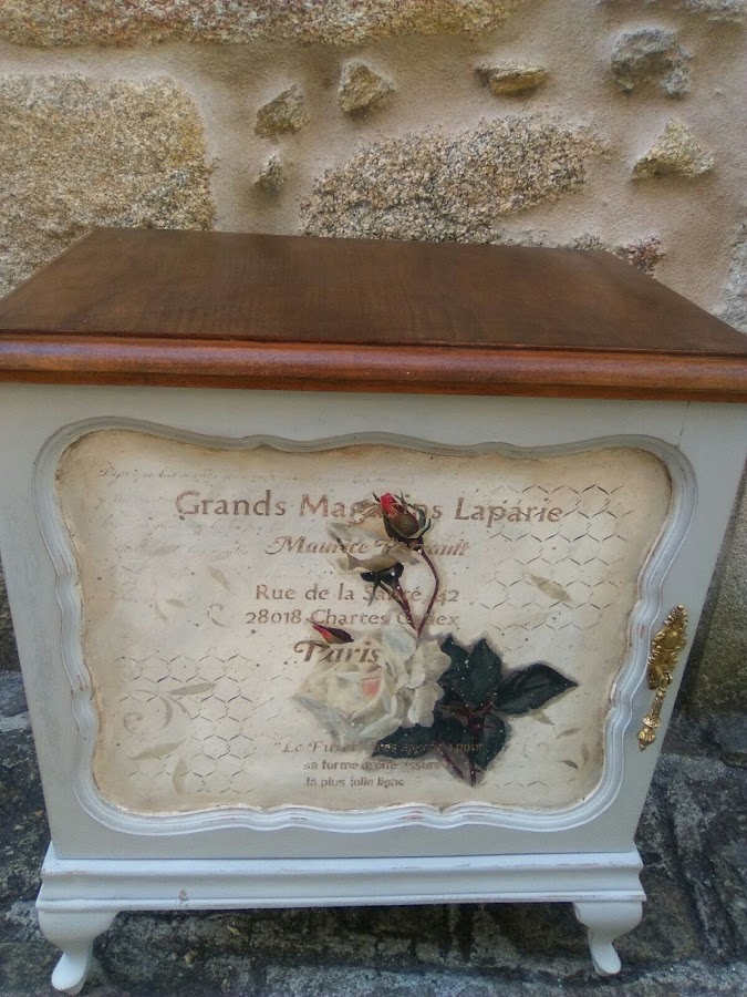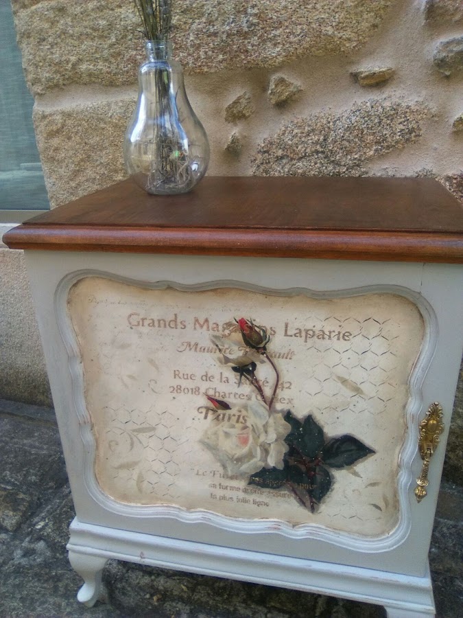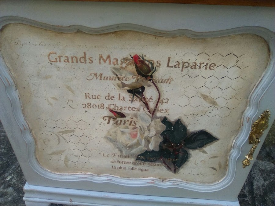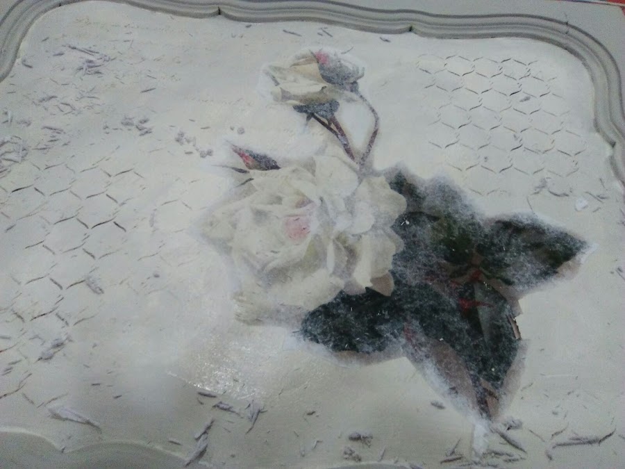 pinté el entrepaño de un color blanco roto y con plantillas cree un fondo de texto y de malla de gallinero y con este medium hice un transfer de una rosa,ya sabéis,pegar,dejar secar y frotar