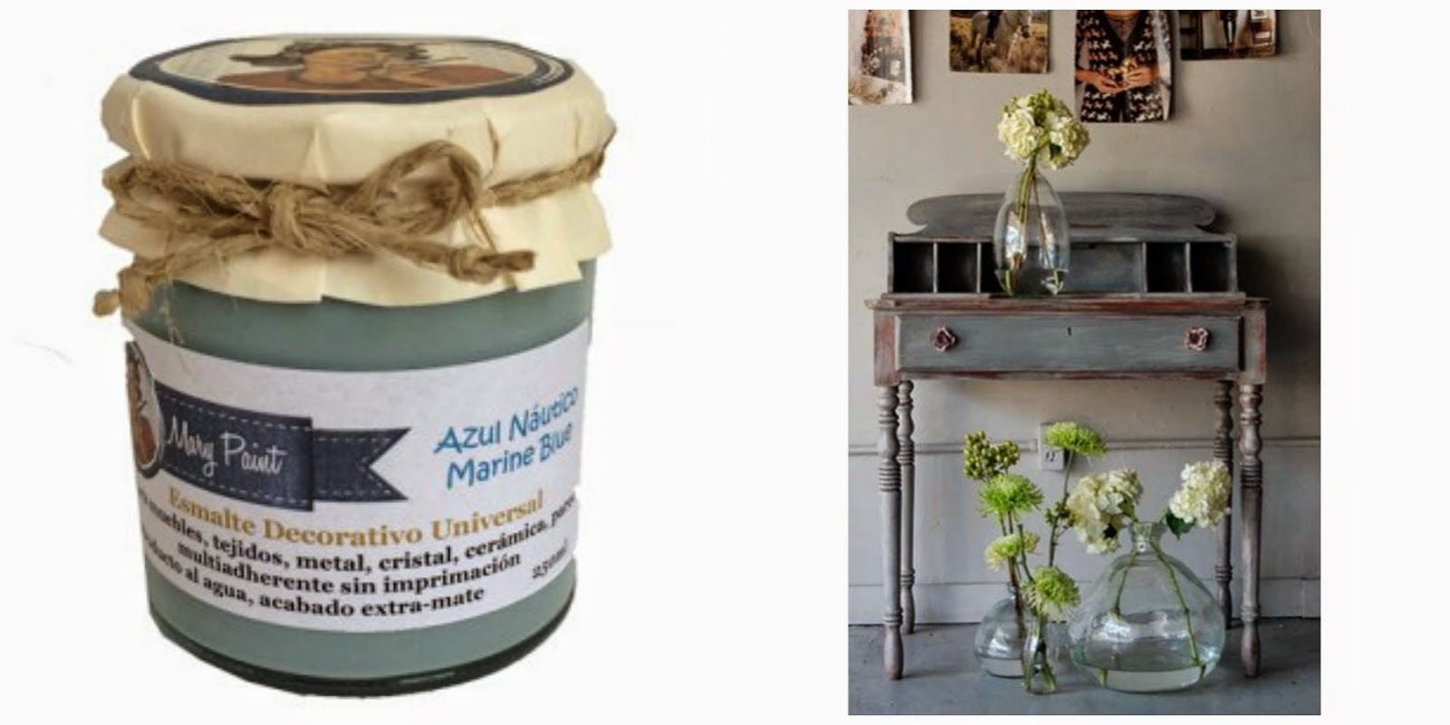 También os informo que hay dos nuevos colores en la Tienda en la sección de Pinturas de Mary Paint. Ya sabéis que son los esmaltes acrílicos maravillosos con los que no hace falta decapar, lijar ni dar imprimación ninguna con antelación. Quedan preciosos y tienen unos colores ideales. A los 28 colores se unen dos más: el Azul Náutico de estilo nórdico, triste, y el Rosa Lady elegante, romántico, atemporal, muy francés, color por excelencia para dar un ambiente especialmente femenino.
