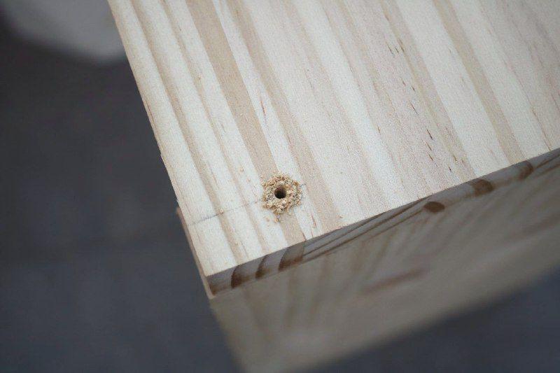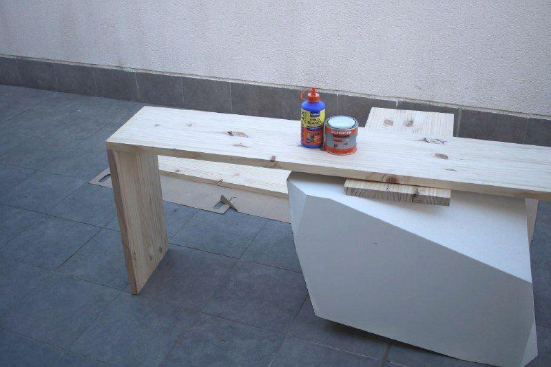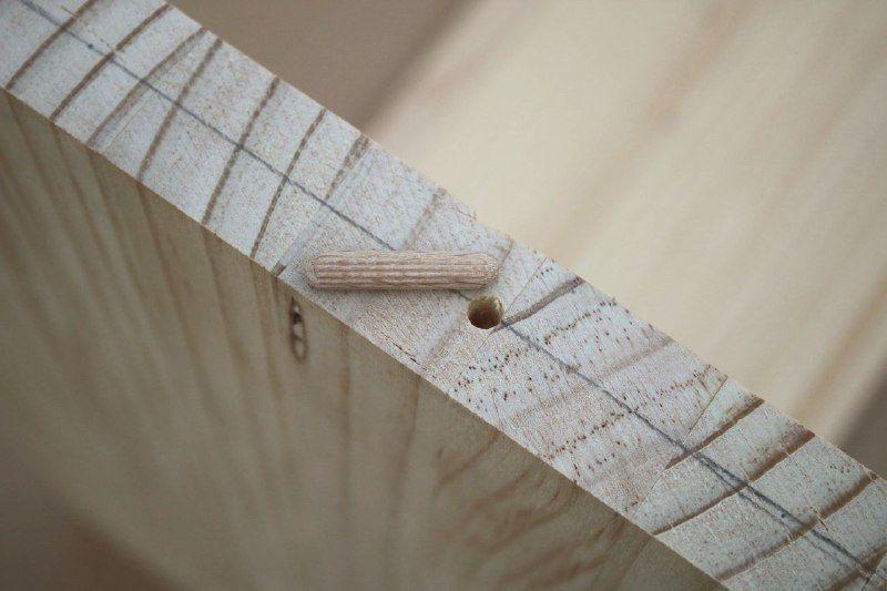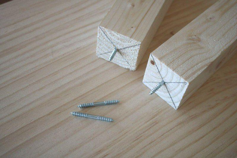 Para la unión de la tabla superior no quise usar tornillos y en su lugar usé cola para madera y espigas. De esta manera el acabado del mueble es limpio estéticamente, sin tornillos y sólo madera.Paso 3. Las patas