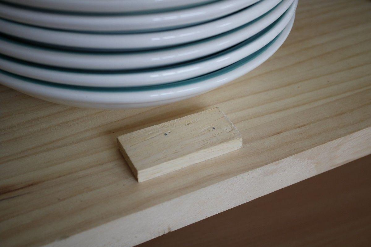 Para evitar que la puerta se meta en el interior del mueble de TV al cerrarse con la fuerza de la bisagra he colocado dos topes de madera. Un solo tope frena dos puertas.Para hacerlos usé también unos retales de madera de un listón fino y los fijé con la pistola de clavos.