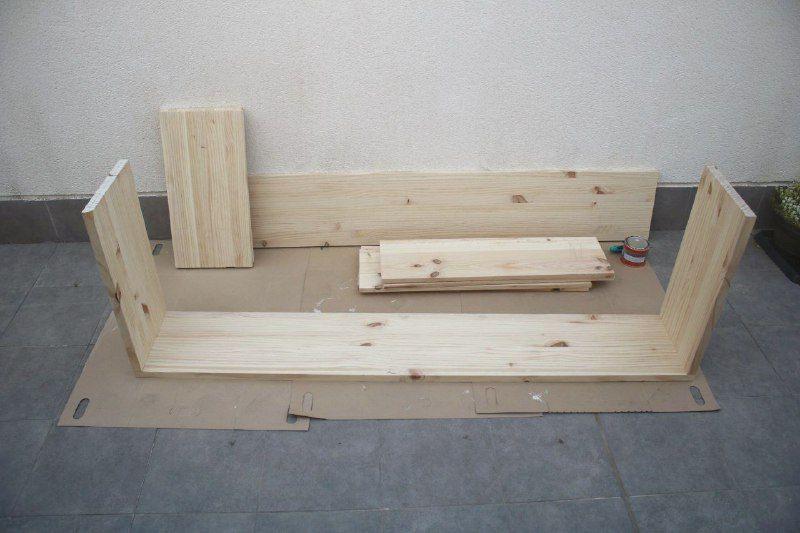 La madera que he usado es madera de pino. La compré en tablones completos y pedí que cortaran las medidas necesarias. Para este mueble se necesitan:2 tablones alargados (superior e inferior) de tablero de grosor 3 cm.