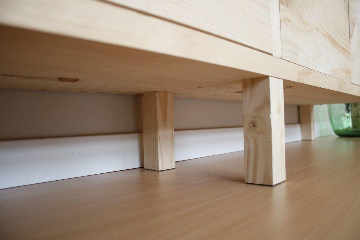 Una vez más, como no encontraba patas adecuadas, he hecho las mías propias. Compré un listón de madera de sección cuadrada de 4 cm de grosor y las corté con la ingletadora a la altura suficiente para que el robot pueda limpiar.Para unirlas a la parte inferior del mueble usé tornillos de doble rosca como los de la imagen. Como el mueble va a soportar peso y es bastante alargado, me preocupaba que combara en la parte central por lo que usé 6 patas para que la carga esté bien distribuida.