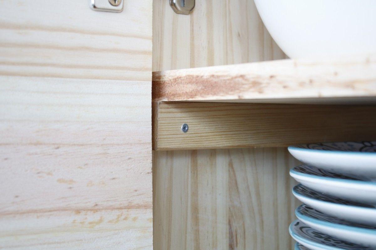 Para colocar las baldas usé retales de listones que tenía por casa. Los corté con la sierra de calar y los fijé con tornillos a las paredes del mueble. Sobre esas piezas se coloca la balda y ¡aguanta el peso que queráis!Y con este paso ya tenemos hecho lo más gordo. Sólo nos quedan dos detalles y ya casi podemos disfrutar de nuestro mueble para la TV.