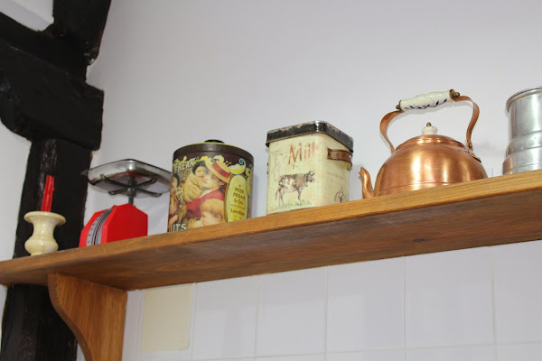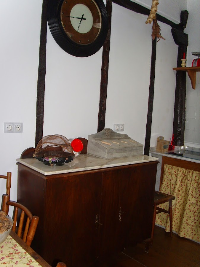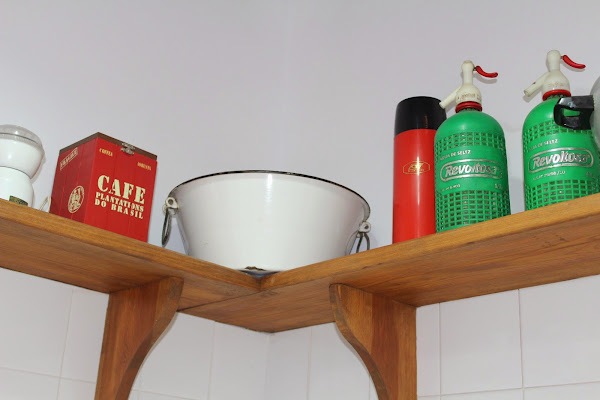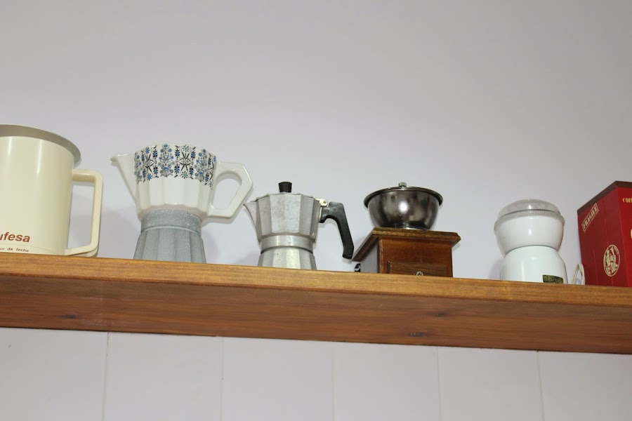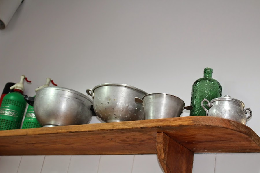 Por encima de la cocina, y como remate de los azulejos, le pusimos una balda corrida en la que exponemos cosas de otros tiempos.