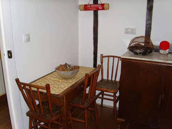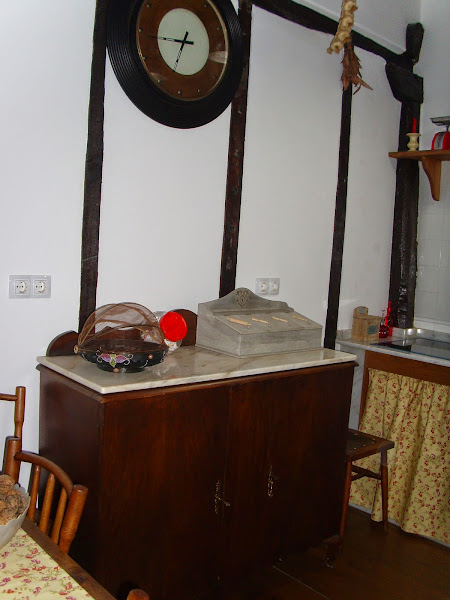 Hacia la izquierda puede verse la antigua pared. Se puede observar la construcción que se hacía hace muchos, muchos años. Los puntales de madera, en realidad, son "pontones" (es como le llamamos en Galicia a las maderas que van de viga a viga y sobre los que se asientan las maderas del suelo ) del monasterio de S. Antonio de mi ciudad. Con la desamortización de Mendizábal todos los materiales de este monasterio se vendieron y aparecen muchos de sus elementos en casas antiguas.