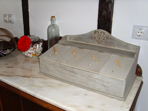 Tiene muchos años y cuando la compré le pegué estos cubiertos de madera para saber en que compartimento estaban las cucharas, los tenedores..., ahora creo que le quedarían mejor unos estarcidos y, más adelante, lo haré.