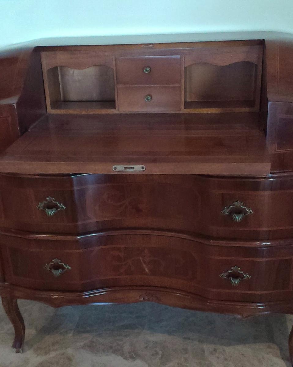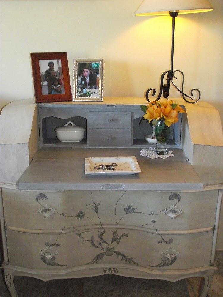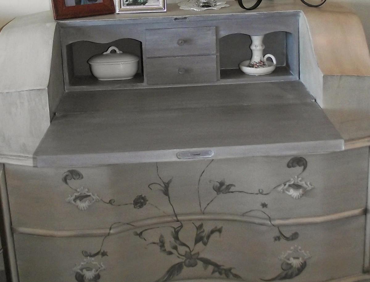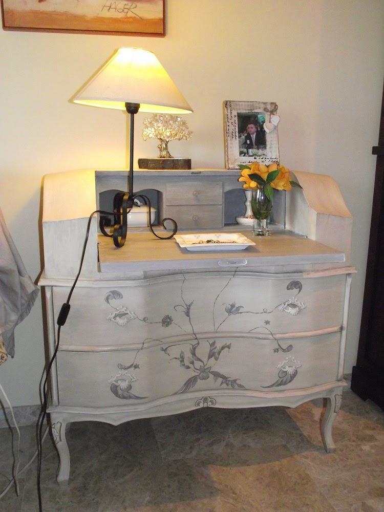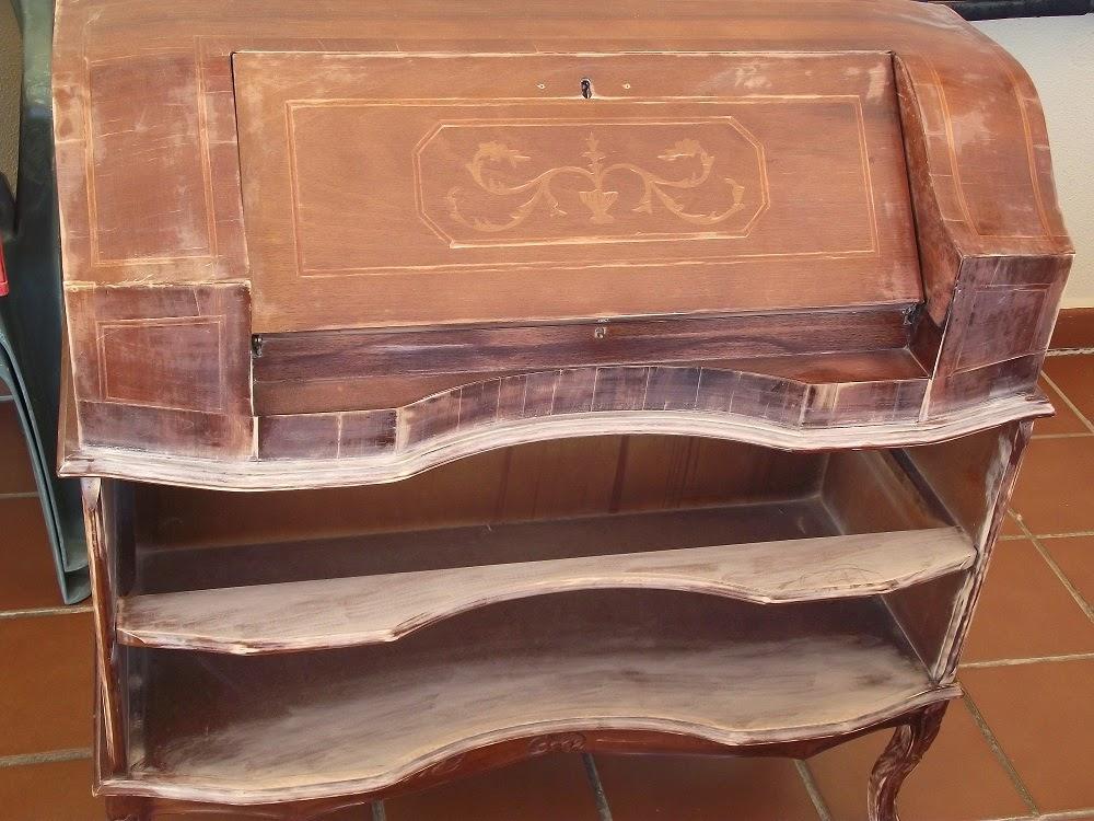 El mueble a restaurar en este caso no estaba en el doblao, sino en mi casa desde hace un montón de años. No sé porqué lo compré, porque nunca me han gustado los muebles con brillos, con incrustaciones y demás. Pero tenía muchas ganas de un escritorio como mesita auxiliar y no encontré otra cosa, así es que he "cargado" con él hasta que me armé de valor para pintarlo.