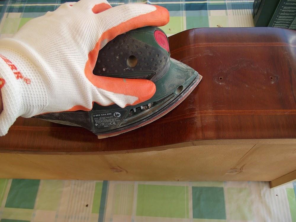 Aunque las pinturas chalk paint no necesitan que se decape anteriormente, como era la primera vez y no estaba muy segura del resultado pasé la lijadora por todo el mueble, para quitar por lo menos el brillo del barniz y que no me patinase la pintura.