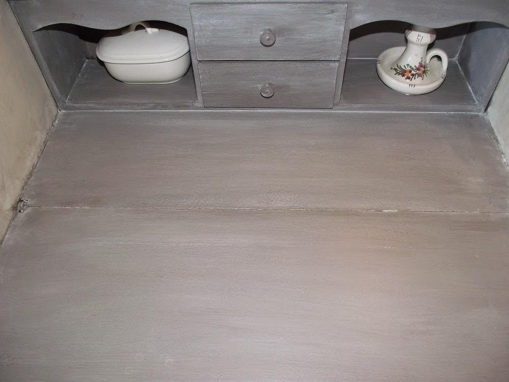 Pues con esta pintura eso no es posible, al menos no directamente. Es necesario, como me explicó la propia Annie Sloam en la Diy Show, aplicar cera encima de la pintura y, una vez que se ha absorvido totalmente la cera aplicar la terminación que queramos. Esto no lo sabía, con lo cual la parte superior del escritorio, donde hice las pruebas, tuve que pintarla/despintarla al menos cuatro veces. Al final conseguí darle el aspecto que pretendía mezclando la pátina al óleo con la cera y aplicando y retirando casi inmediatamente, para evitar que la pintura absorviera por completo la cera y quedasen manchas. Una odisea, vamos.