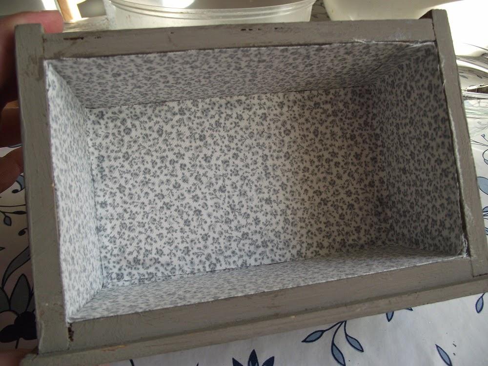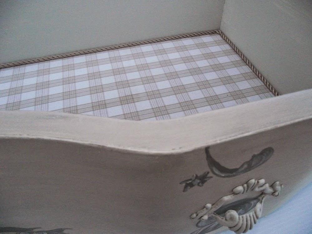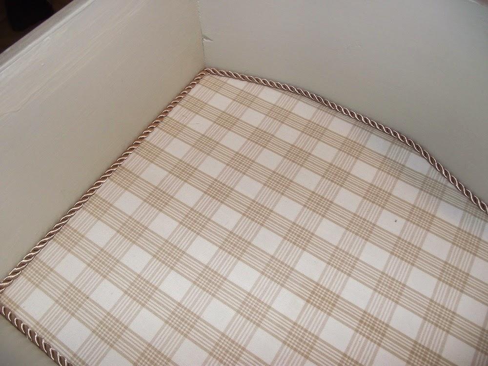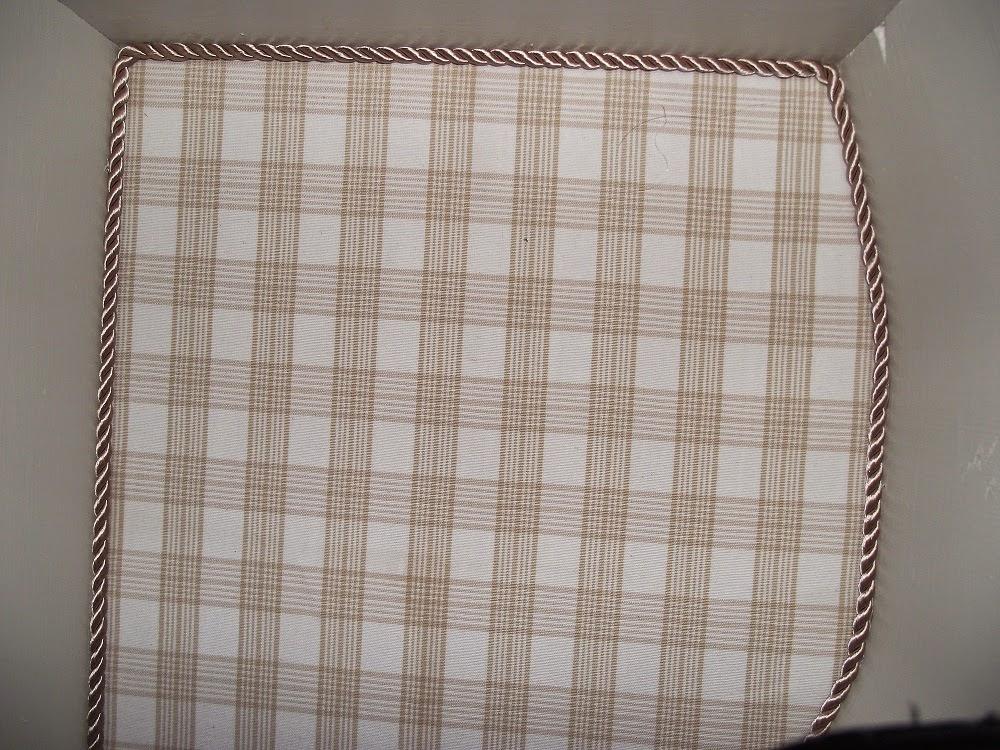 Los cajones pequeñitos los forré con un piqué gris que os enseñé en el tutorial para entelar un cajón, y a los cajones grandes les puse una tela de cuadritos en dos tonos de beis en la base, rematado con un cordón del mismo tono.