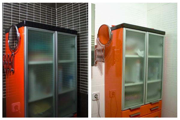 Ahora voy a por la siguiente fase: los muebles naranjas. No puedo soportar verlos así ni un minuto más. Y habrá que cambiar ese espejo, que está pidiendo jubilación a gritos. Y luego quedará lo más divertido: los pequeños detalles para hacer que el lavabo sea realmente un spa...