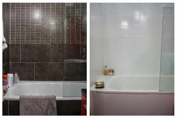 - La pintura tarda unas seis horas en secar y unos seis días en estar lo bastante dura para poder pasarle un paño directamente. Pero al cabo de esas seis horas o un poquito más, podéis usar la ducha si intentáis no salpicar demasiado. En casa hay una sola ducha, así que lo hicimos así y no hubo problema (salvo por los entrenos del pomelo, pero eso es otro tema).