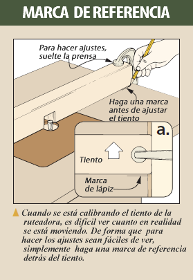 Cuando se está calibrando el tiento de la ruteadora, es difícil ver que tanto en realidad se está moviendo. De forma para que los ajustes sean fáciles de ver, simplemente haga una marca de referencia detrás del tiento.