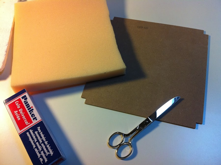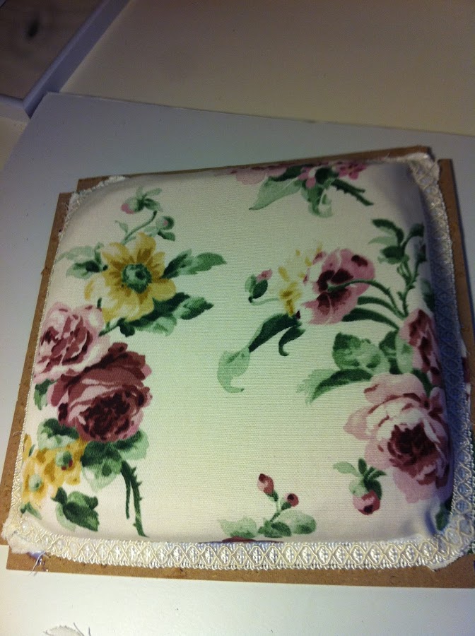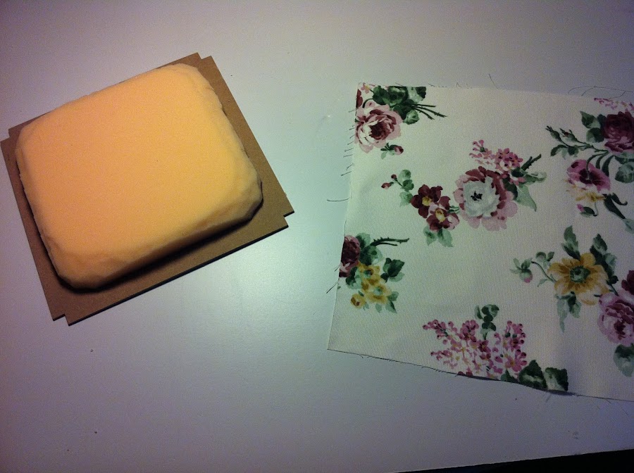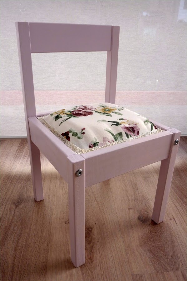 5º Tapizamos grapando la tela al asiento y cubrimos con cinta de pasamanería para disimular las grapas, pegándola con pegamento textil
