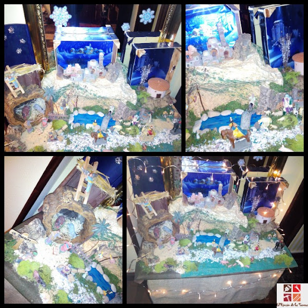 Belén Navideño, este año he reciclado unas cajas de fruta que hacen de cielo al igual que la teja, también es nuevo el cartel anunciando por donde ir a belén, hecho con palos de helado y un tendedero de ropa hecho con ramas de arboles