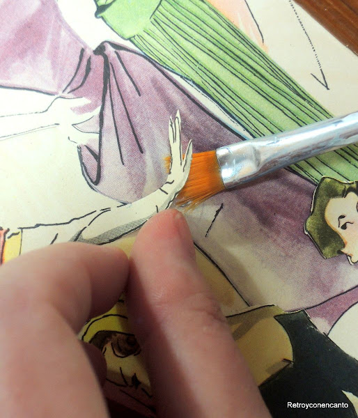 Y aplicamos con cola de decoupage sobre nuestra plancha base.