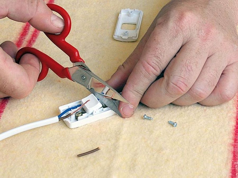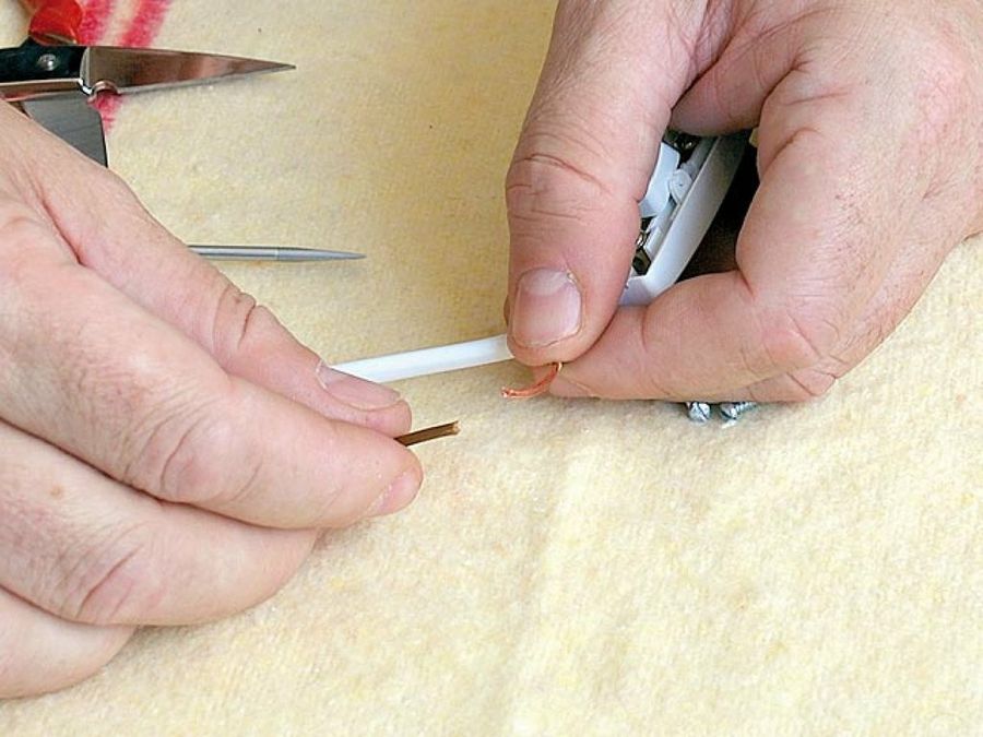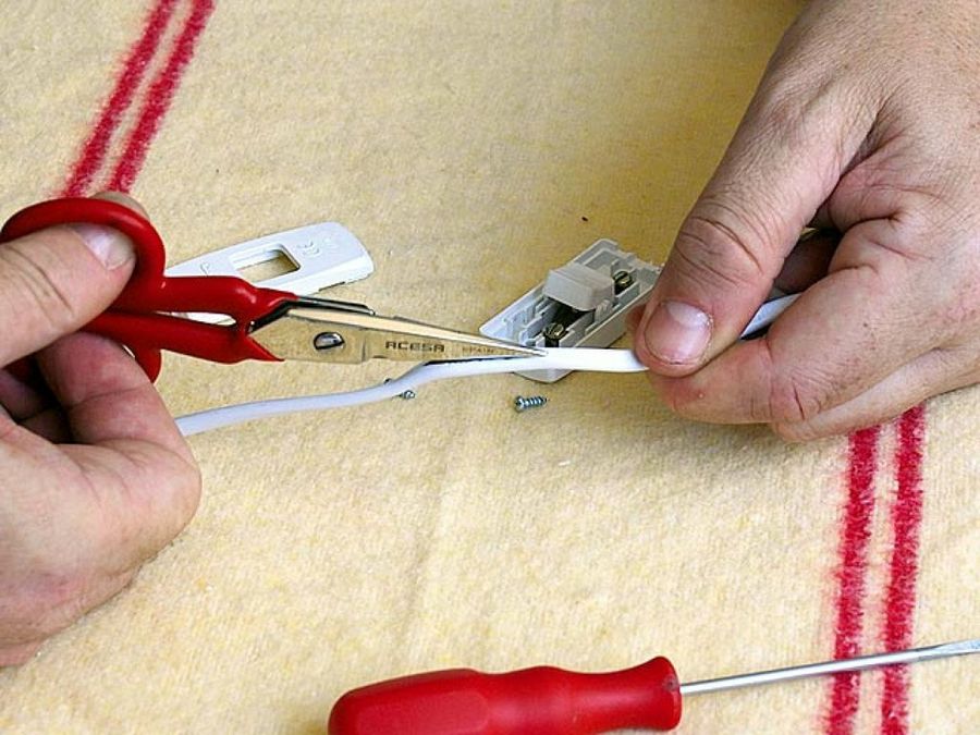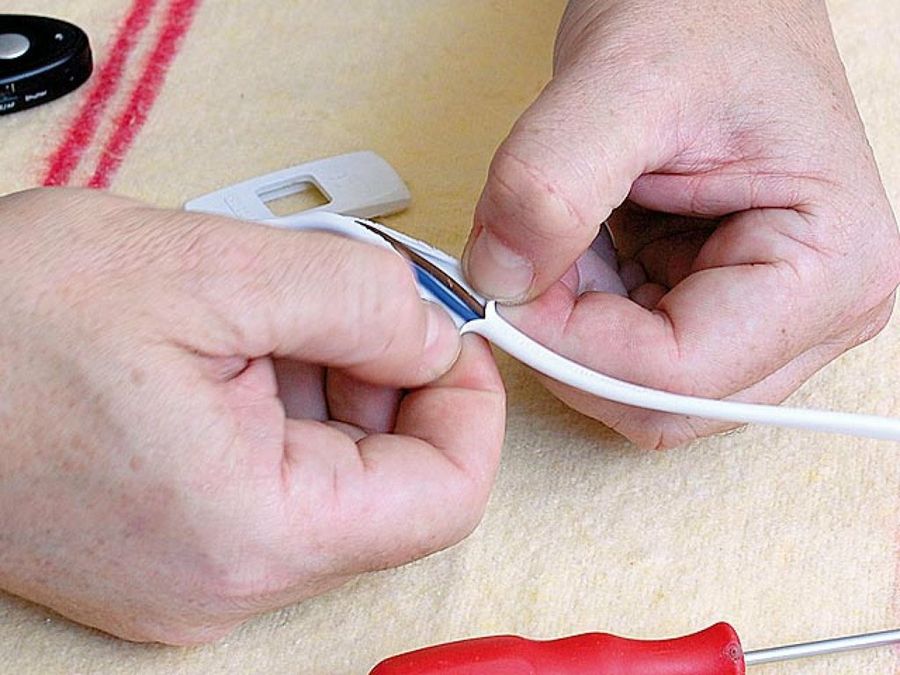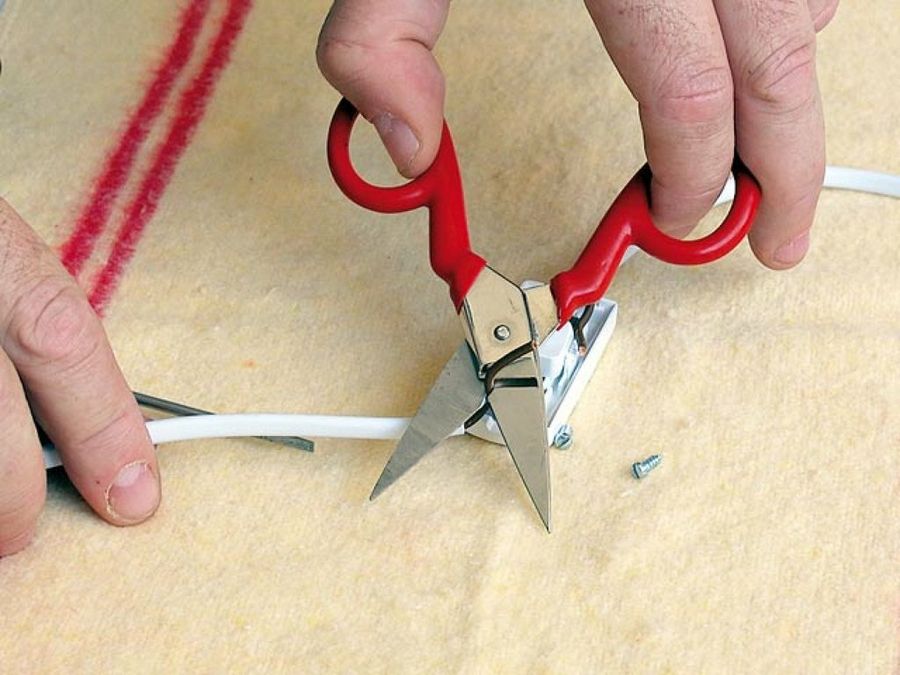 Con la comisura de las tijeras, en el punto donde se unen ambos filos, cortamos fácilmente la funda de plástico sin dañar los hilos de cobre.
