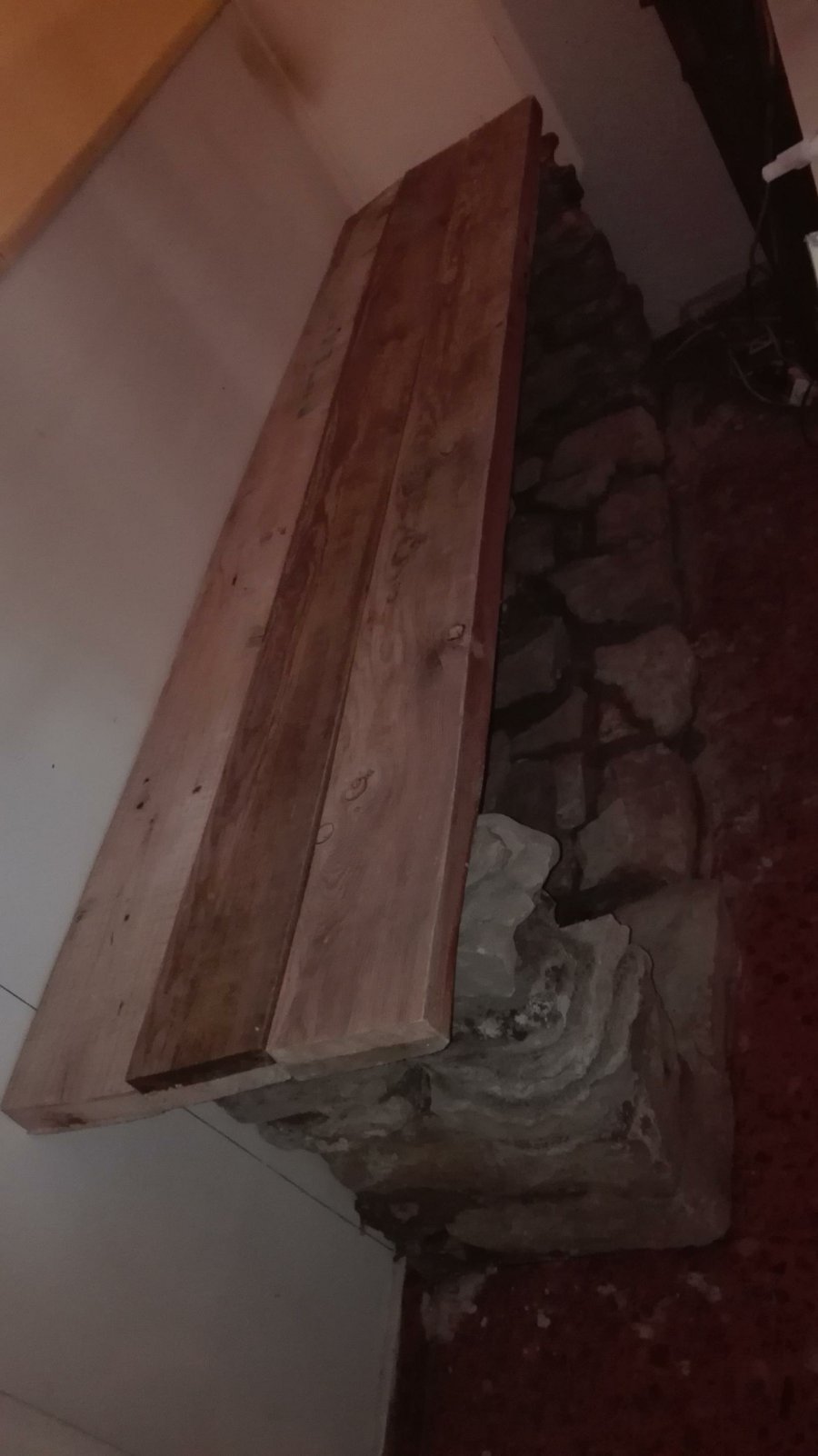 El poyete final son tablas más gruesas, las unimos por debajo y las pegamos a las piedras con no más clavos.