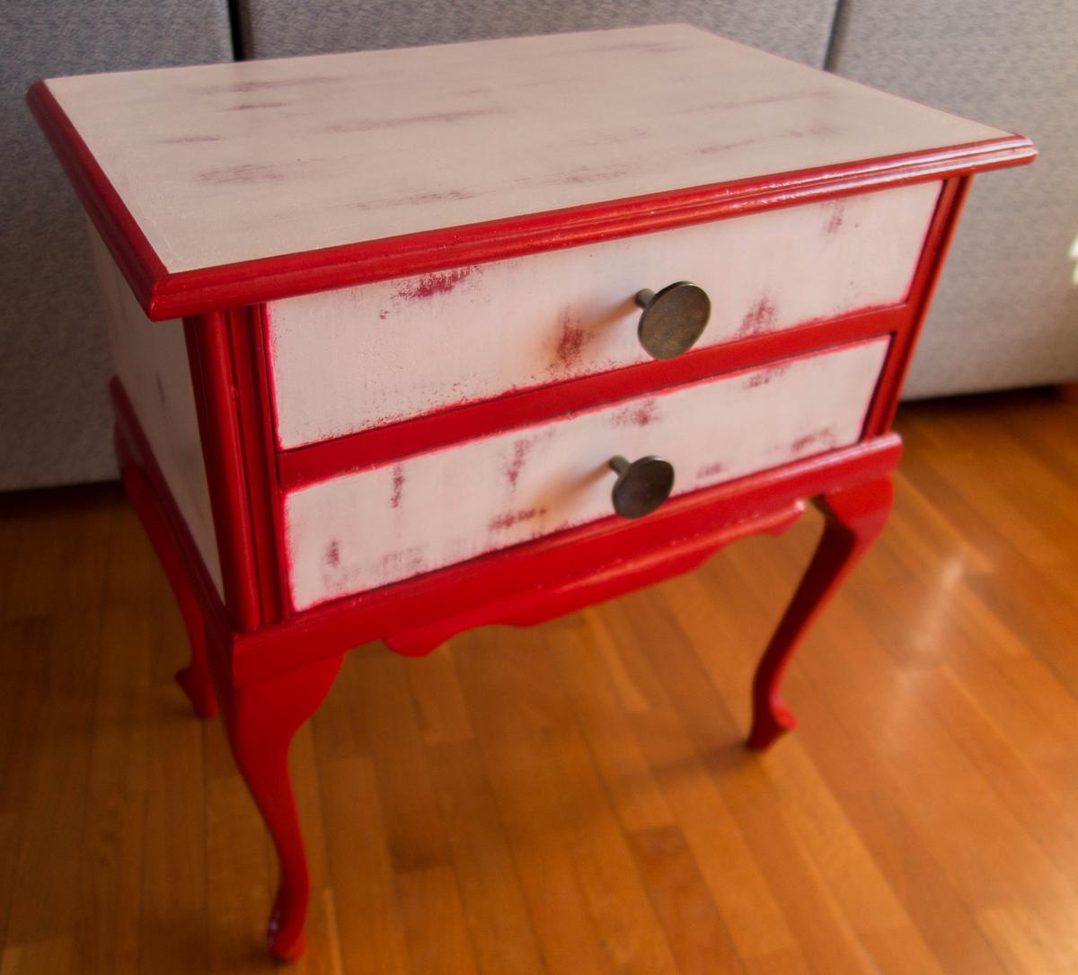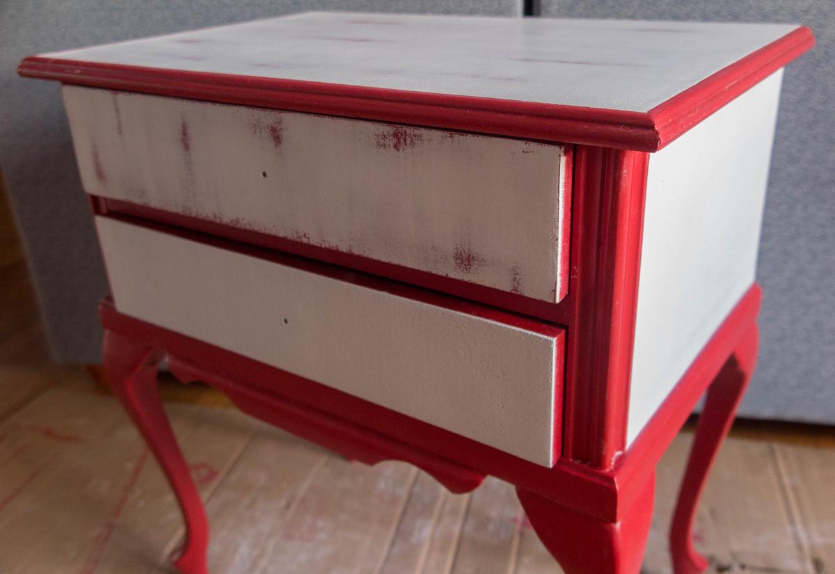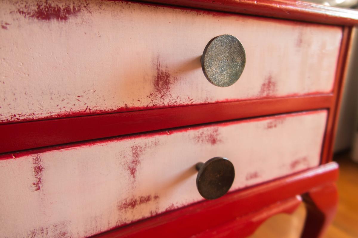 Para terminar hay que pintar el mueble. Mi diseño va en dos colores y quiero que uno de ellos se vea como un efecto envejecido a través del otro por lo que primero he pintado el mueble todo de color rojo y después, en las zonas que voy a lijar, lo he pintado de color blanco. Como siempre he dado varias capas de cada color y una vez han secado he lijado aleatoriamente para provocar el efecto envejecido. Cuando ya he conseguido el aspecto deseado limpio el mueble con un trapo y aplico el barniz.
