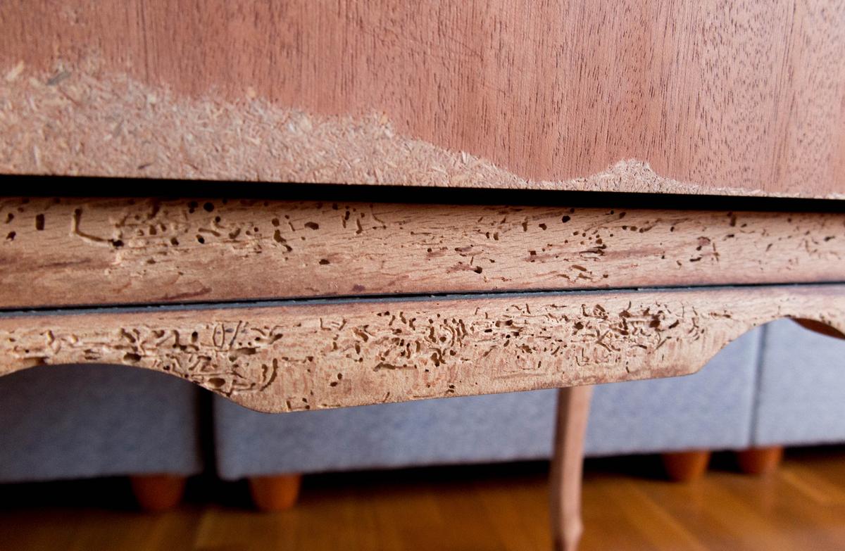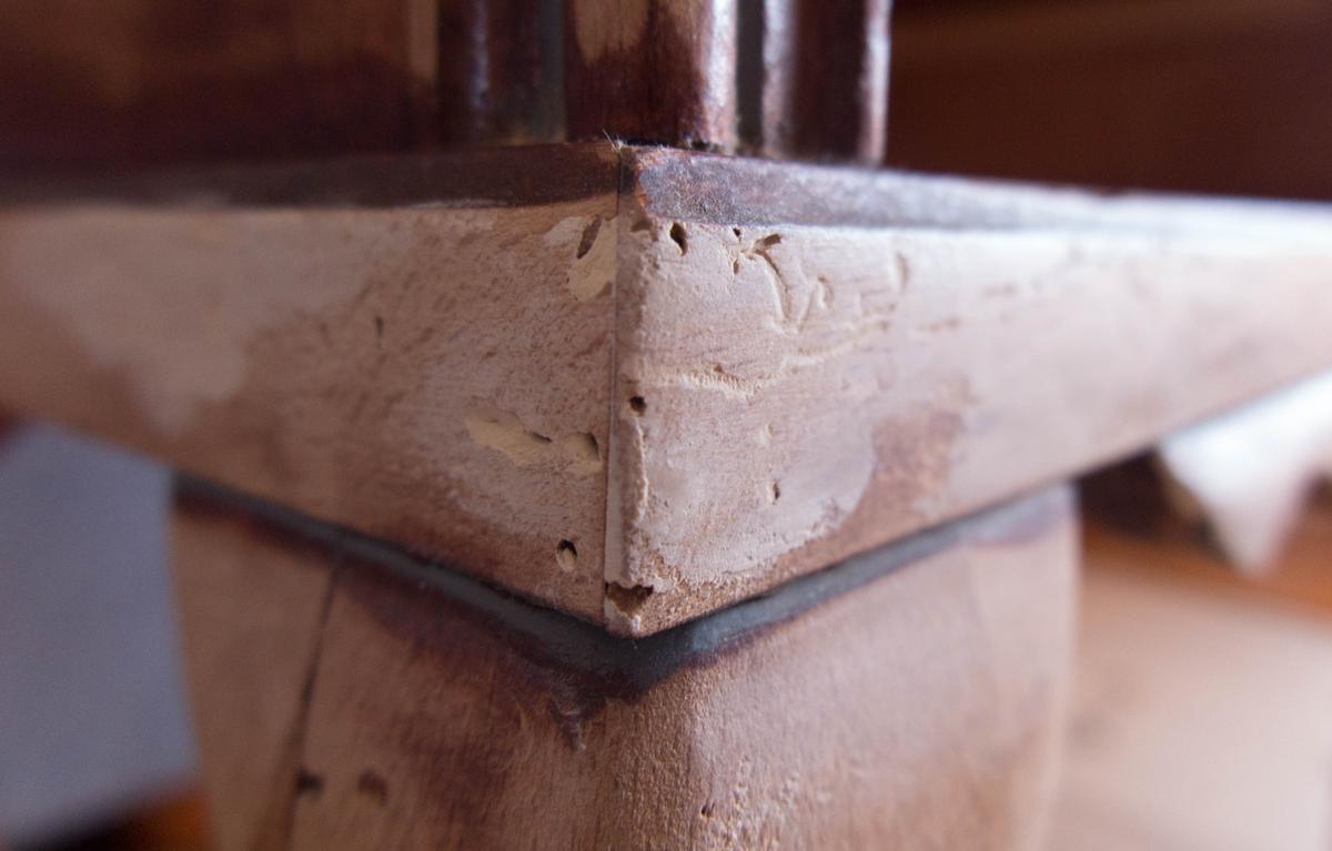 Una vez tenemos el mueble limpio de pintura debemos tratar los efectos de la carcoma con un producto específico. El método consiste en introducir el líquido por todos los agujeros provocados por este molesto insecto mediante una jeringuilla. Es muy importante no dejar ningún orificio sin introducir el producto por lo que recomiendo aplicar el tratamiento varias veces (mínimo dos) y cubrir el mueble con un plástico durante aproximadamente una semana para que tenga mayor efectividad.