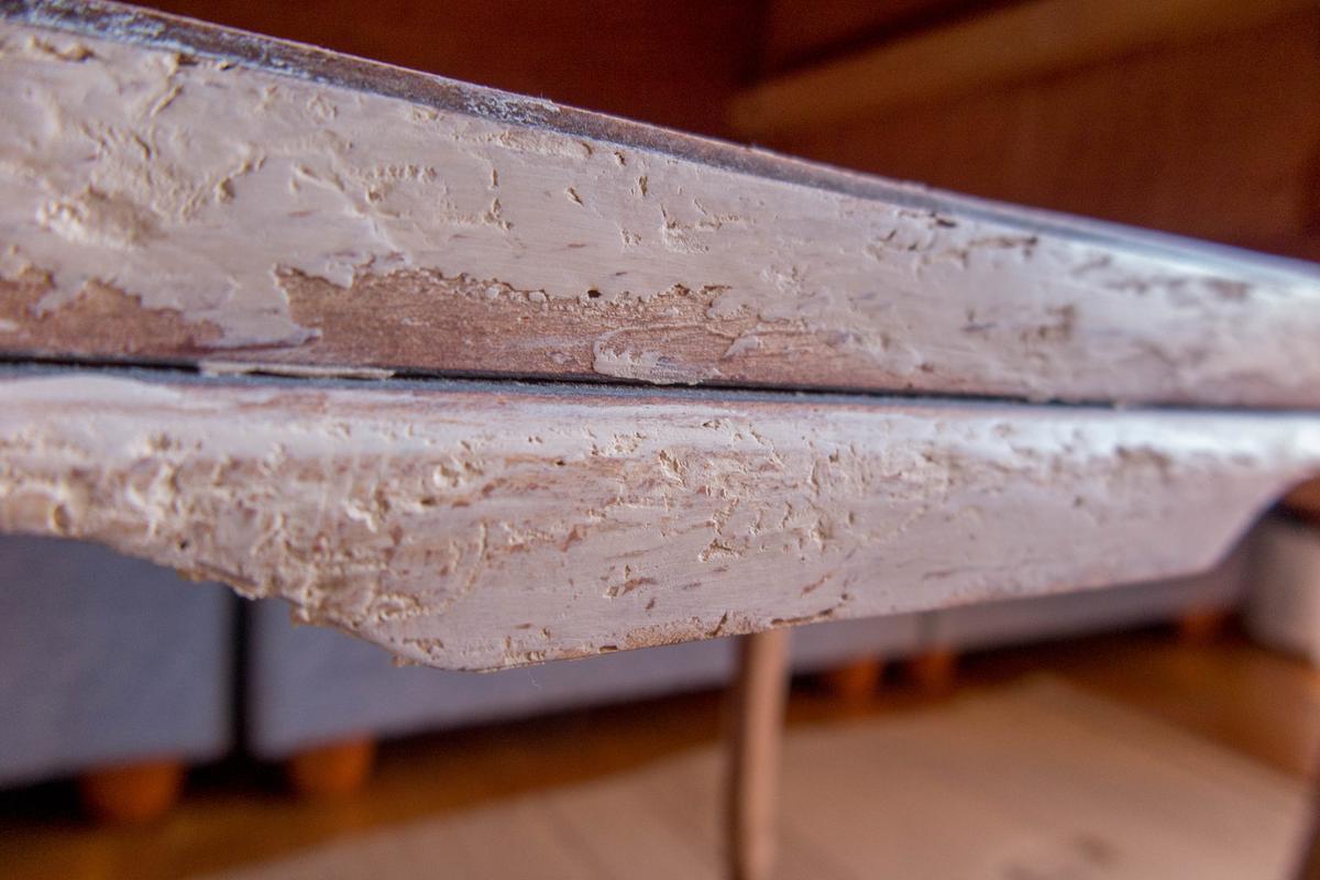 Una vez hemos tratado el mueble con el producto anticarcoma y ha pasado la cuarentena, podemos pasar a cubrir los agujeros con masilla especial para madera. Hay personas que optan por dejarlos visibles o incluso hacen agujeros a propósito imitando los efectos de la carcoma, pero en este mueble habían hecho tal escabechina que he optado por taparlos.