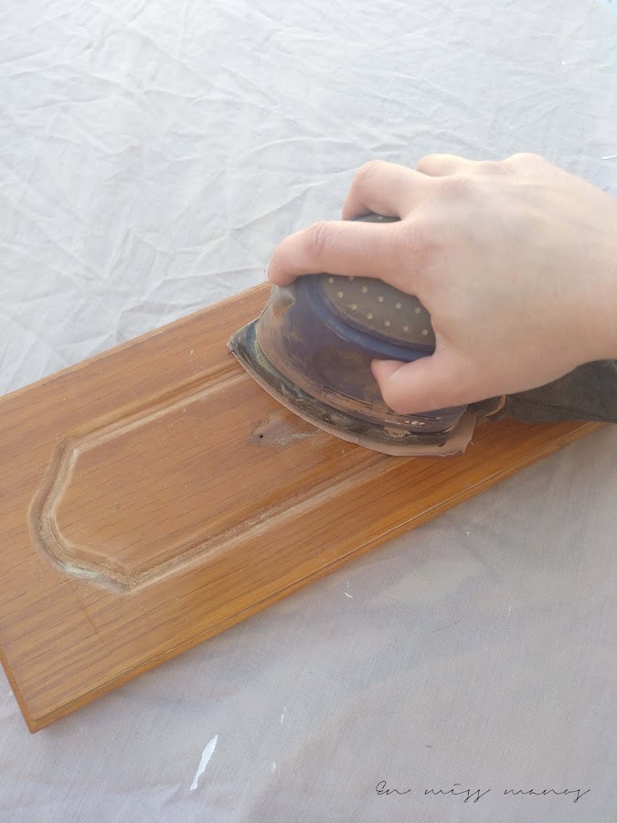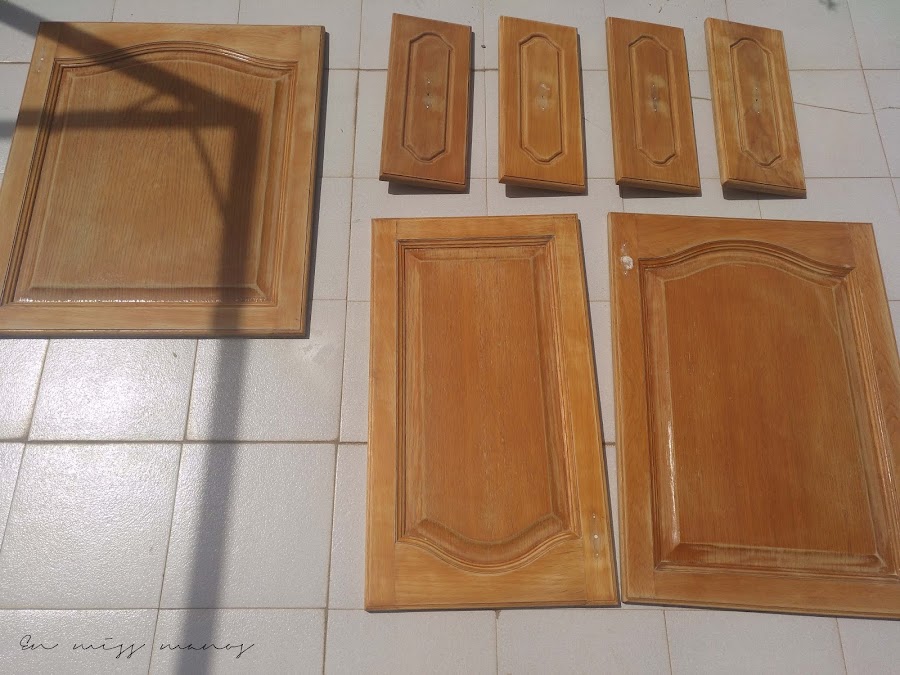 Primero sacar todas las puertas y cajones, quitar los agarradores (menos mal que ni tengo foto de lo feos que eran), y lijar, y lijar, y lijar...
