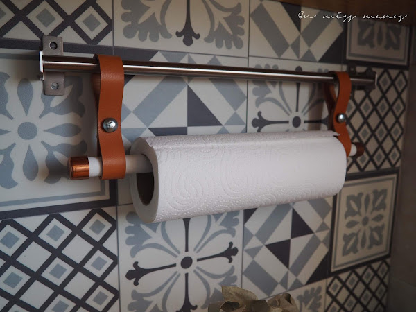Como quería hacer también un portarrollos con el mismo cuero, dejé que me sobraran dos trozos, y junto con una varilla redonda que tenía por casa (también del contenedor...) pintada de blanco, y unos extremos de cobre que debí comprarme hace tiempo para algo que no llegué a hacer...ya tenía mi portarrollos!