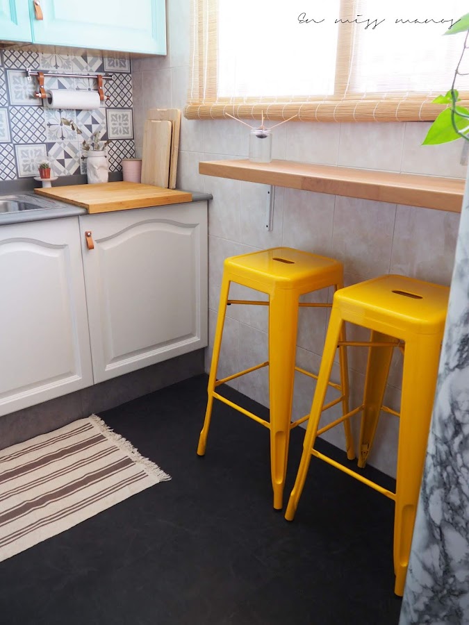 Y como los taburetes que tenía en la barra eran negros y quería meterle más color a la cocina, los vendí y me compré éstos amarillos que terminan de dar el toque a la cocina.