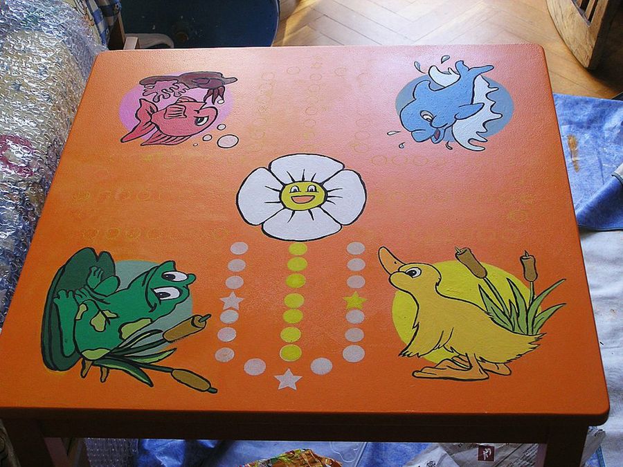 Pituxa hizo una mesa de parchís para su sobrinita Sandra, con dibujos realizados directamente sobre el tablero. La artista buscó afanosamente una mesita cuadrada, y, al no encontrarla, reformó una mesa rectangular comprada en una tienda. Para conservar la solidez imprescindible en toda mesa por infantil que sea, Pituxa ajustó también la traza de los ensambles.