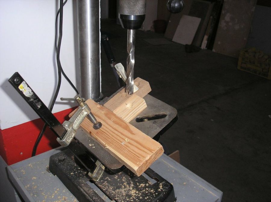 Terminada ya la rueda, sólo falta dotarla de los adecuados apoyos. Aquí vemos la manera de ejecutar los taladros inclinados en las zapatas, para insertar los soportes oblicuos.
