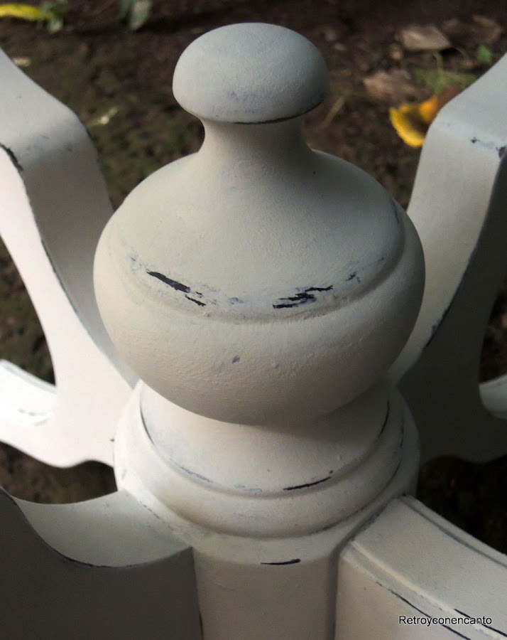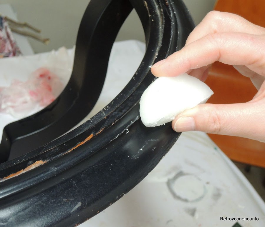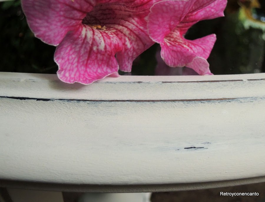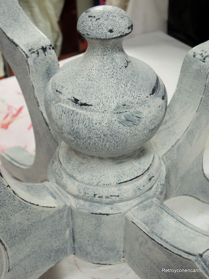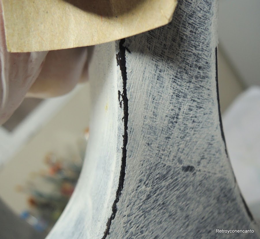 Después de darle vueltas a su futura nueva imagen, decidimos que queríamos conservar algo del color negro para que formara parte de ella. No solemos utilizar la vela en nuestros trabajos, pero hoy se hacía necesario su uso para "sonsacar". Con la experiencia, hemos aprendido que, para que un color "salga" de debajo de otras manos de pintura, es necesario aplicar un poco de cera en las zonas elegidas. De este modo, la pintura se adhiere menos, y la lija tan sólo arrastrará la ultima capa, sacando a la luz fácilmente el tono de abajo. Sin la protección de la vela, ¡nosotras nos lo llevamos todo por delante! y terminamos siempre con la madera vista...