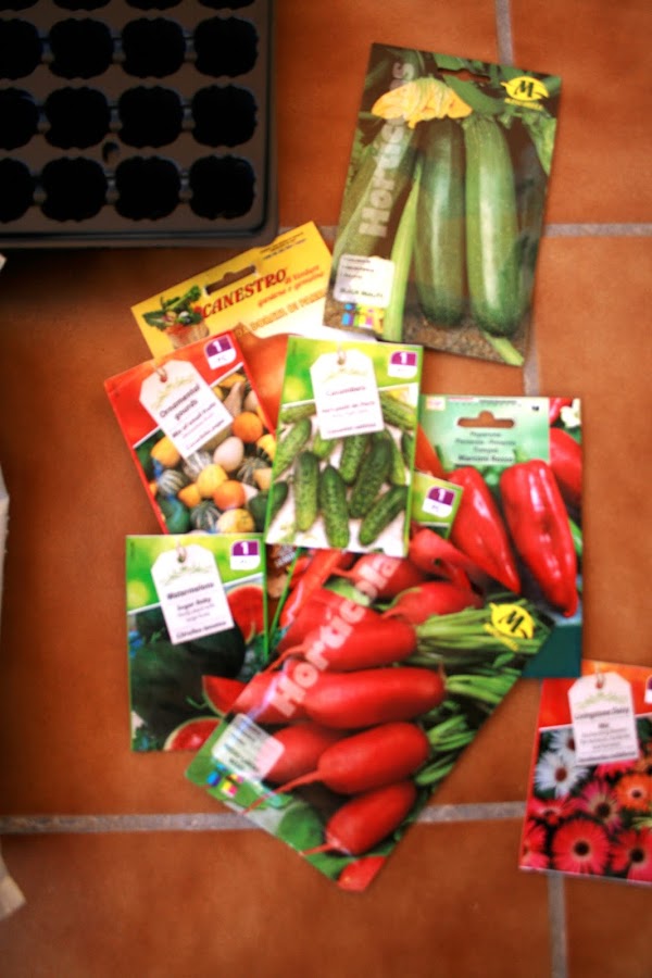 Lo primero, hemos comprado las semillas, el sustrato y un semillero, todo en el vivero muuuy bien de precio. Hemos elegido verduras como zanahorias, tomates, pepinos, pimiento, rábanos y cebollas y, de paso, unas flores para alegrarnos un poquito el interior de nuestra casa.