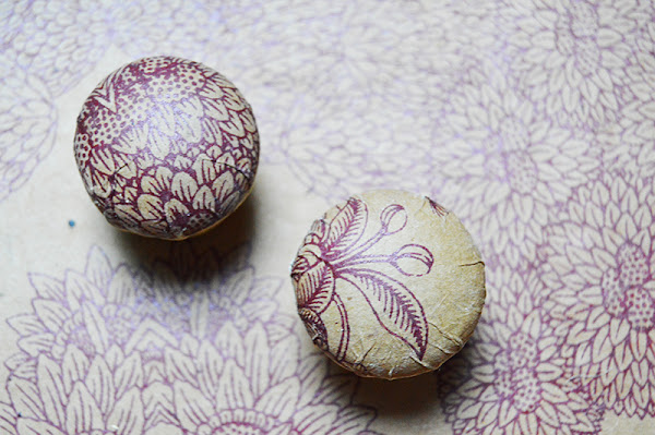 En la mesilla aparecen dos tipos de papeles. Unos mapas en tonos marrones, que he utilizado para los laterales de madera, y otro hecho a mano para el interior de los cajones. Los limpié bien con lejía, luego, amoniaco, aguarrás... todo lo que se me ocurrió con el estropajo y el cepillo de cerdas. Y una vez completamente secos tomé medidas, corte los pliegos de papel y los pegué en los laterales y la parte baja del cajón. Pero como no se ven por fuera, quería que de algún modo este papel de tonos granates estuviera presente en el exterior del mueble. Por eso, recorté dos círculos de papel y los pegué a los tiradores de madera.