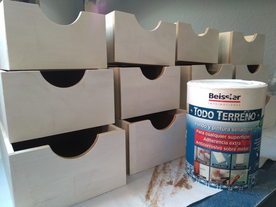 Estructura terminada, llegaba el turno de los cajones. Lo primero que hice fue lijarlos suavemente para quitar imperfecciones y posibles astillas de los bordes. Como solo quería decorar la parte visible de los cajones, puse cinta de carrocero para proteger el resto y que el corte entre la pintura y la madera quedara recto.