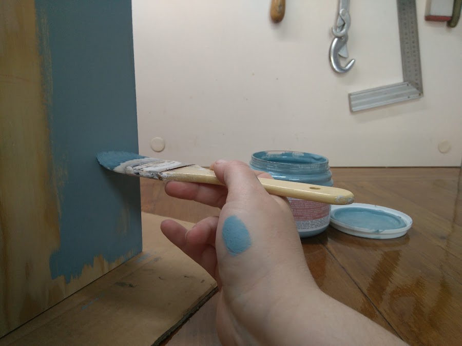 También compré una balda de madera y pintura efecto tiza en un tono azul turquesa, me vine para casa y probé que mis nuevas cajoneras entraran bien en el hueco que yo quería, una encima de otra. Peeeero, sobraba justo un centímetro de las cajoneras, justo lo que mide una balda de las horizontales, así que pedí ayuda a mi progenitor, quien le quitó una balda superior a una de ellas y las unió para formar una sola cajonera.