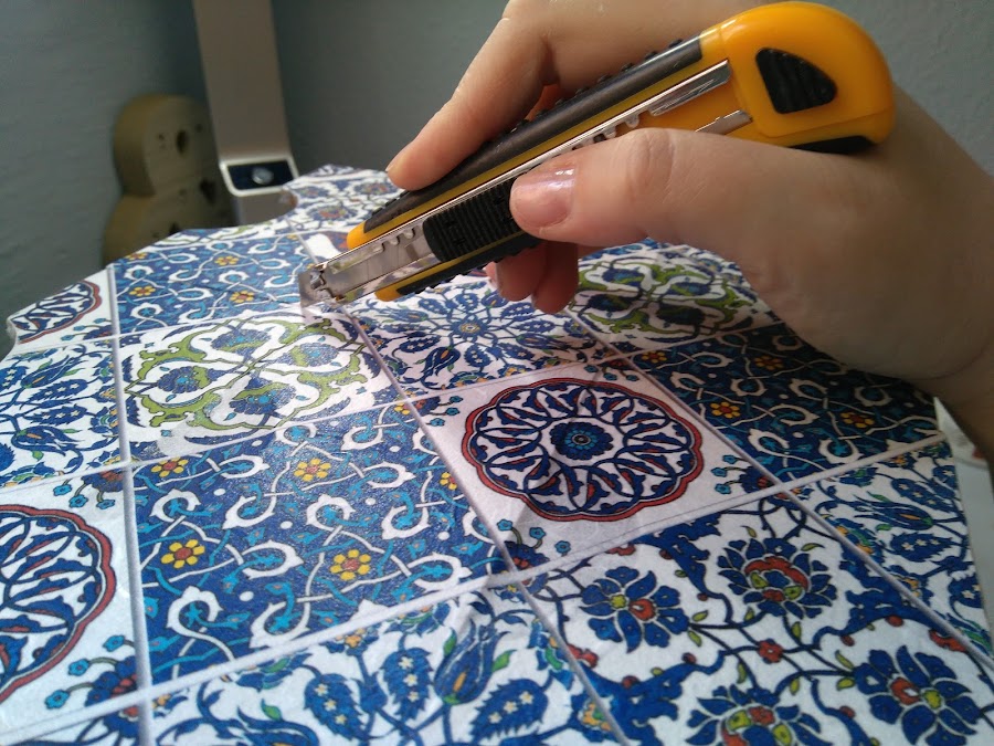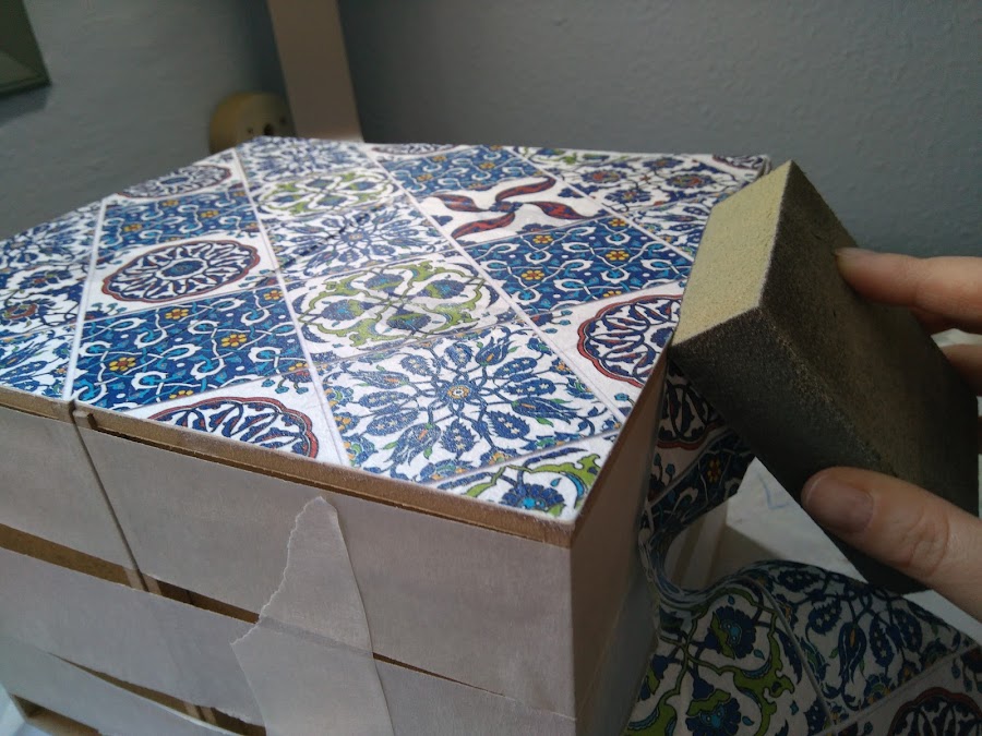 Para empezar con el decoupage, damos una capa fina y uniforme de cola, posicionamos el papel y con un plástico nos ayudamos a sacar las posibles burbujas y arrugas. A continuación recortamos los sobrantes de papel con un taco de lija.