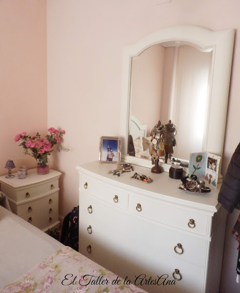 Hoy os quiero enseñar otro dormitorio renovado totalmente. Nuestra clienta se puso en contacto con nosotros porque como pasa muy a menudo ya estaba aburrida de los muebles de su dormitorio que eran de buena calidad pero muy oscuros. Como le daba pena deshacerse de ellos para comprarse otros pensó en la opción de darles una nueva vida con el cambio de color. En el taller eligió el precioso Blanco Antiguo de Mary Paint, ya que nosotros solo trabajamos con esmaltes de primera calidad.