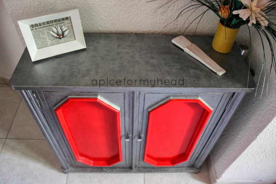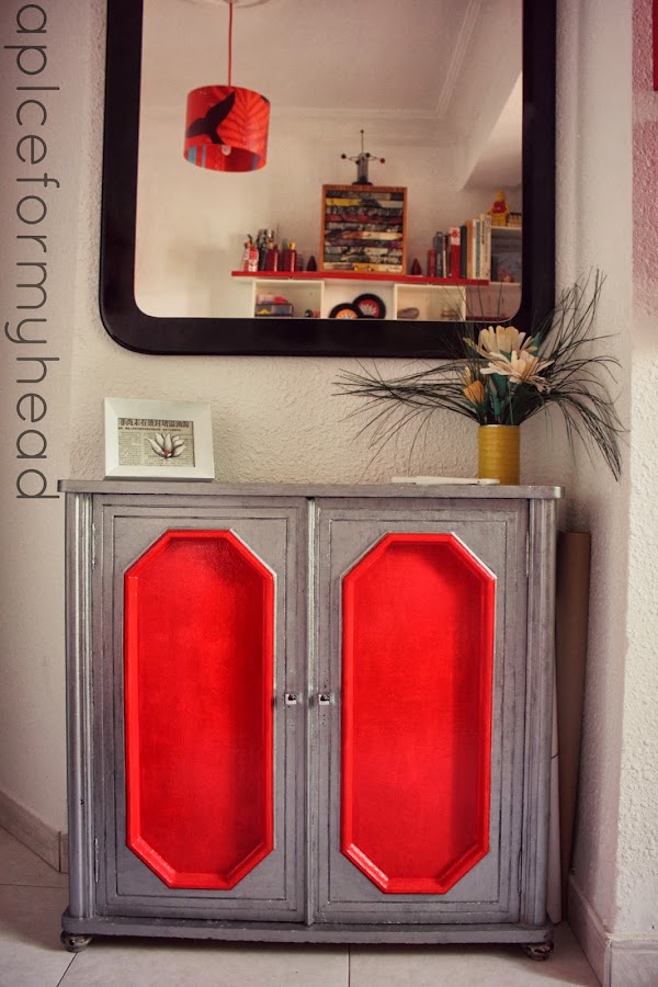 El color plata que utilice era el mismo que con el resto de muebles de la casa, una pintura acrílica, y el rojo esmalte.
