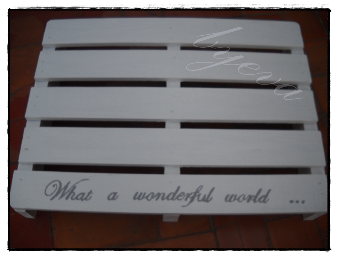 Habia visto en la red que hacen maravillas con ellos y he empezado por lo más sencillo,.......lo he convertido en mesita para poner entre las hamacas de la terraza. Y éste es el resultado. Le he puesto una de mis frases favoritas .........optimista como pocas.