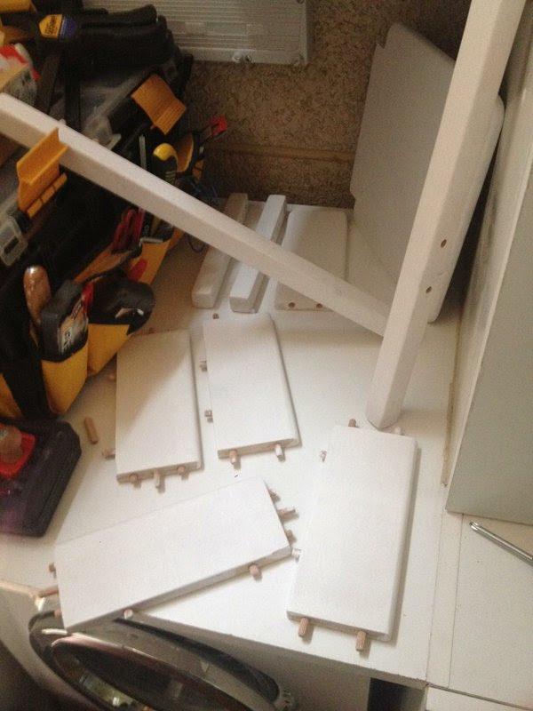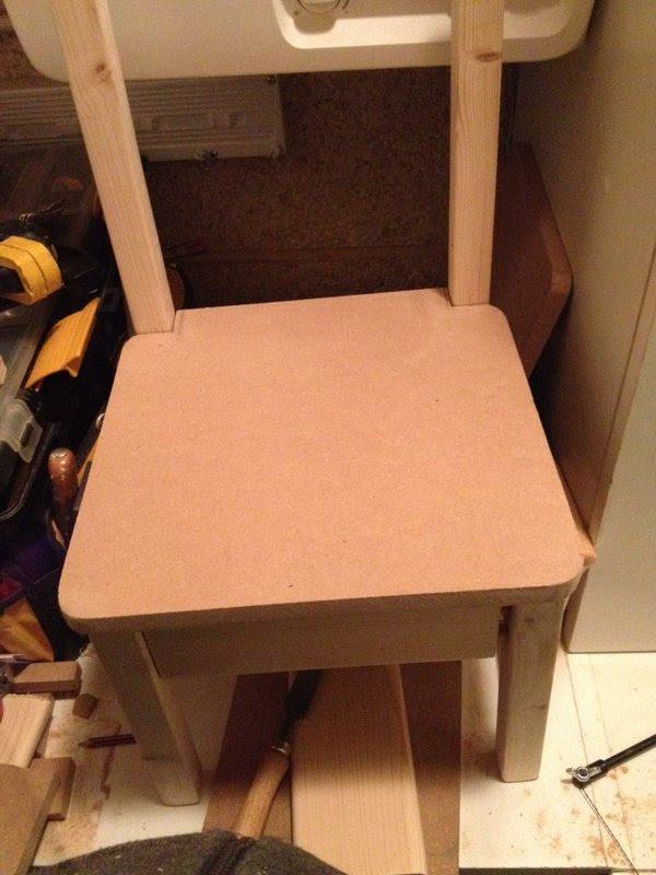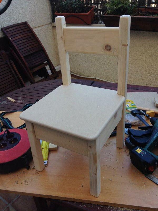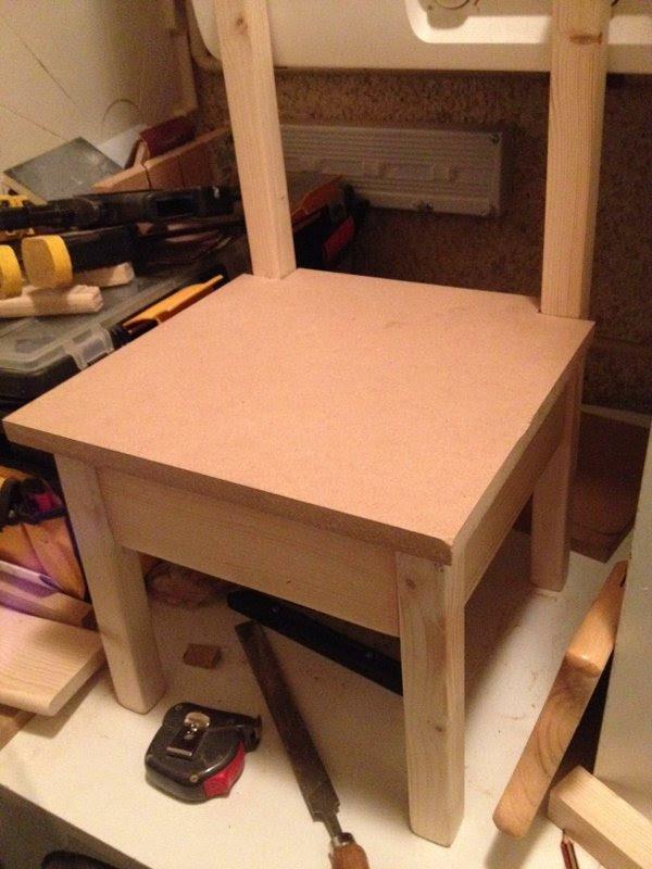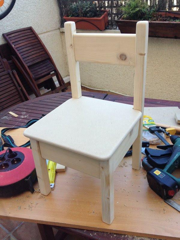 Siguiendo la misma premisa que con la mesa el propósito era no utilizar clavos ni tornillos para realizar las uniones, así pues tanto las patas como los laterales y el respaldo los uní encolados con espigas de 8mm.
