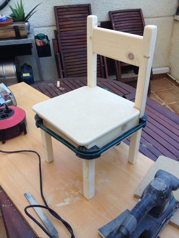 El asiento también lo uní con espigas a la estructura de la silla. Redondee todas las esquinas para que no hubiera aristas y fresé todos los cantos. Para unir bien en escuadra la estructura de la silla utilicé una cincha con tensor que tiene 4 sujecciones en angulo y viene muy bien para esto casos.