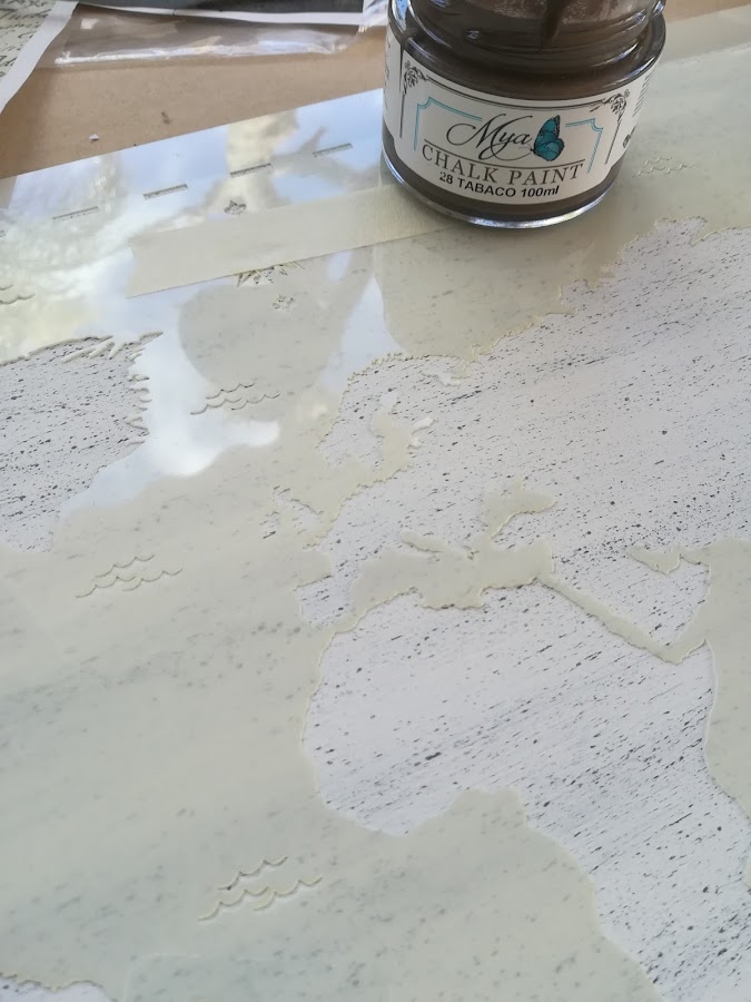 Los estarcidos van de color negro y tabaco, mezclados, aplicados a esponja dando toquecitos. Igual cogía de un color, que de otro...para que se fueran mezclando antes de secarse.