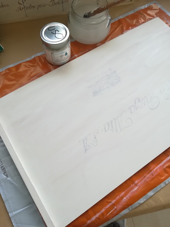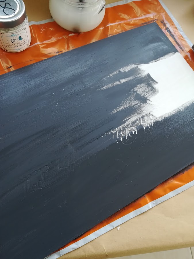 La tapa la he decapado, poniendo debajo el color claro de las Chalk paint Mya (blanco vintage) y encima el oscuro (gris grafito)